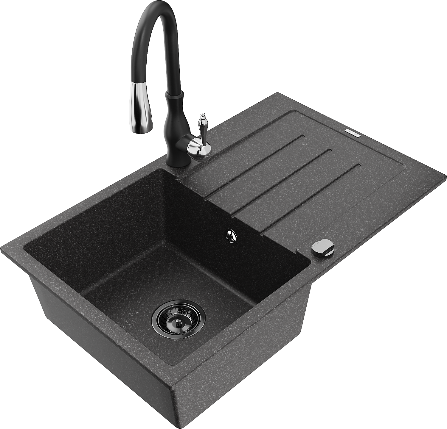 Mexen Bruno chiuvetă din granit cu 1 cuvă, cu scurgător și baterie de bucătărie Savita, negru picurat - 6513-76-672601-70-B