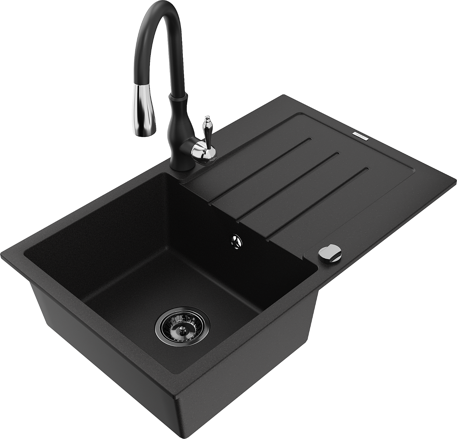 Mexen Bruno chiuvetă din granit cu 1 compartiment și scurgător și baterie de bucătărie Savita, negru - 6513-77-672601-70-B