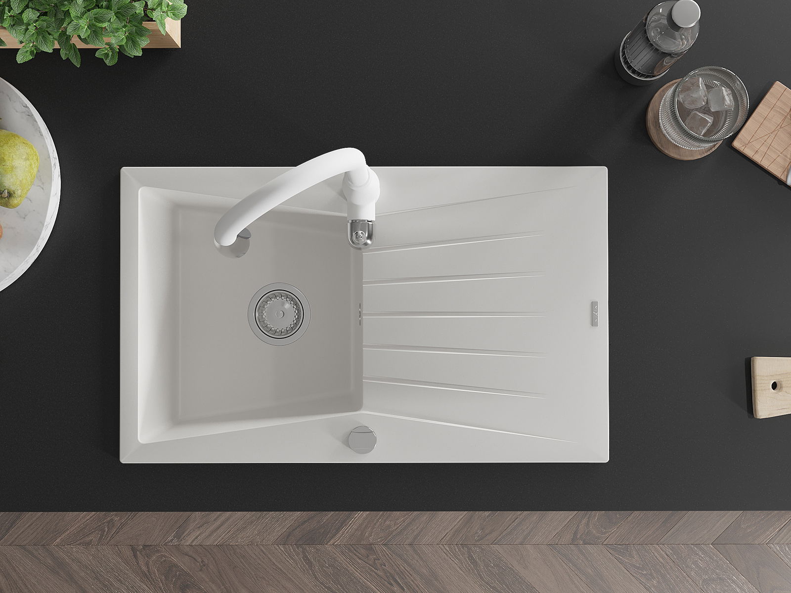 Suprafața chiuvetei este rezistentă la pete și decolorare, ceea ce o face ușor de întreținut și își păstrează culoarea pentru o perioadă lungă de utilizare. Un complet estetic și practic pentru orice bucătărie.