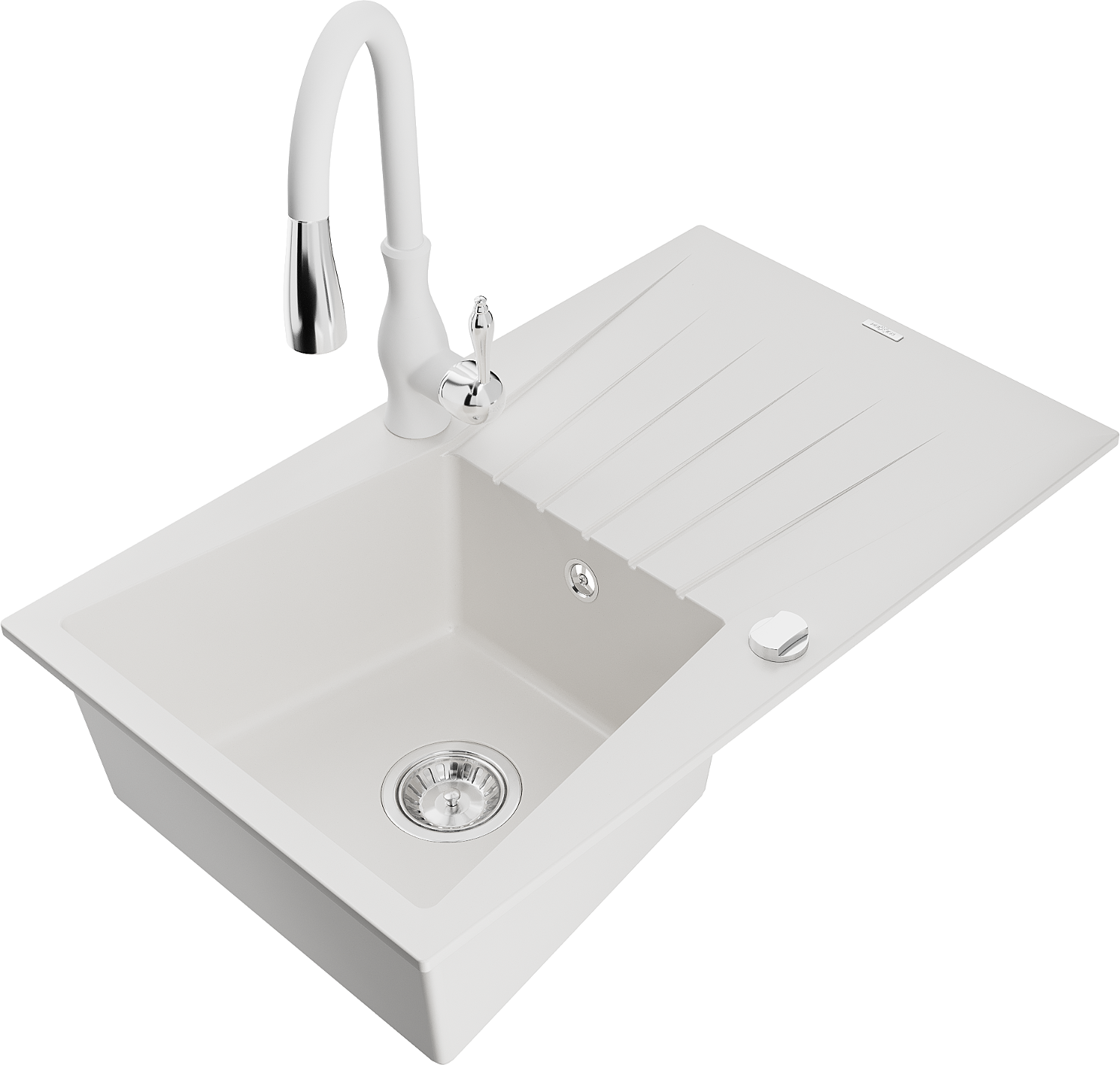 Mexen Cesar chiuvetă de granit cu o singură cuvă cu scurgător și baterie de bucătărie Savita, alb - 6514-20-672601-20