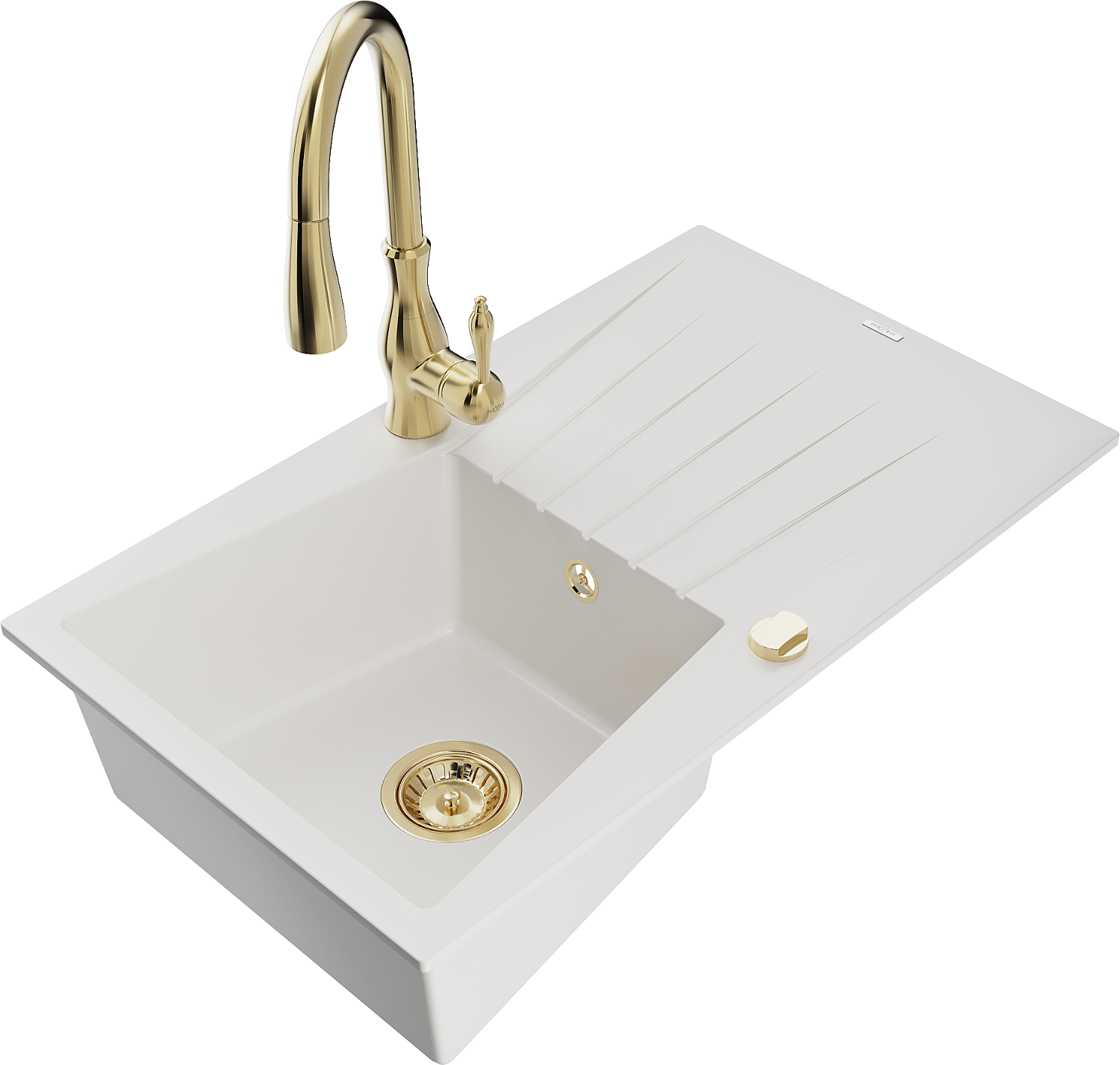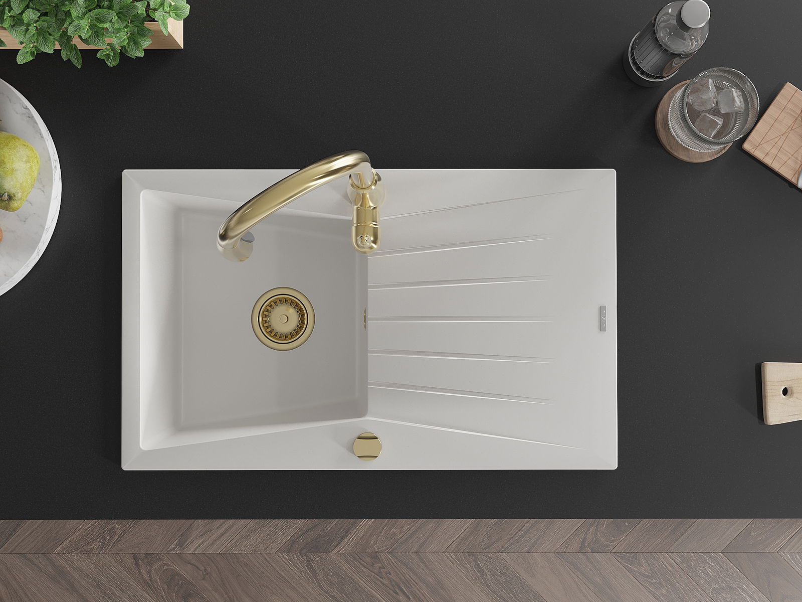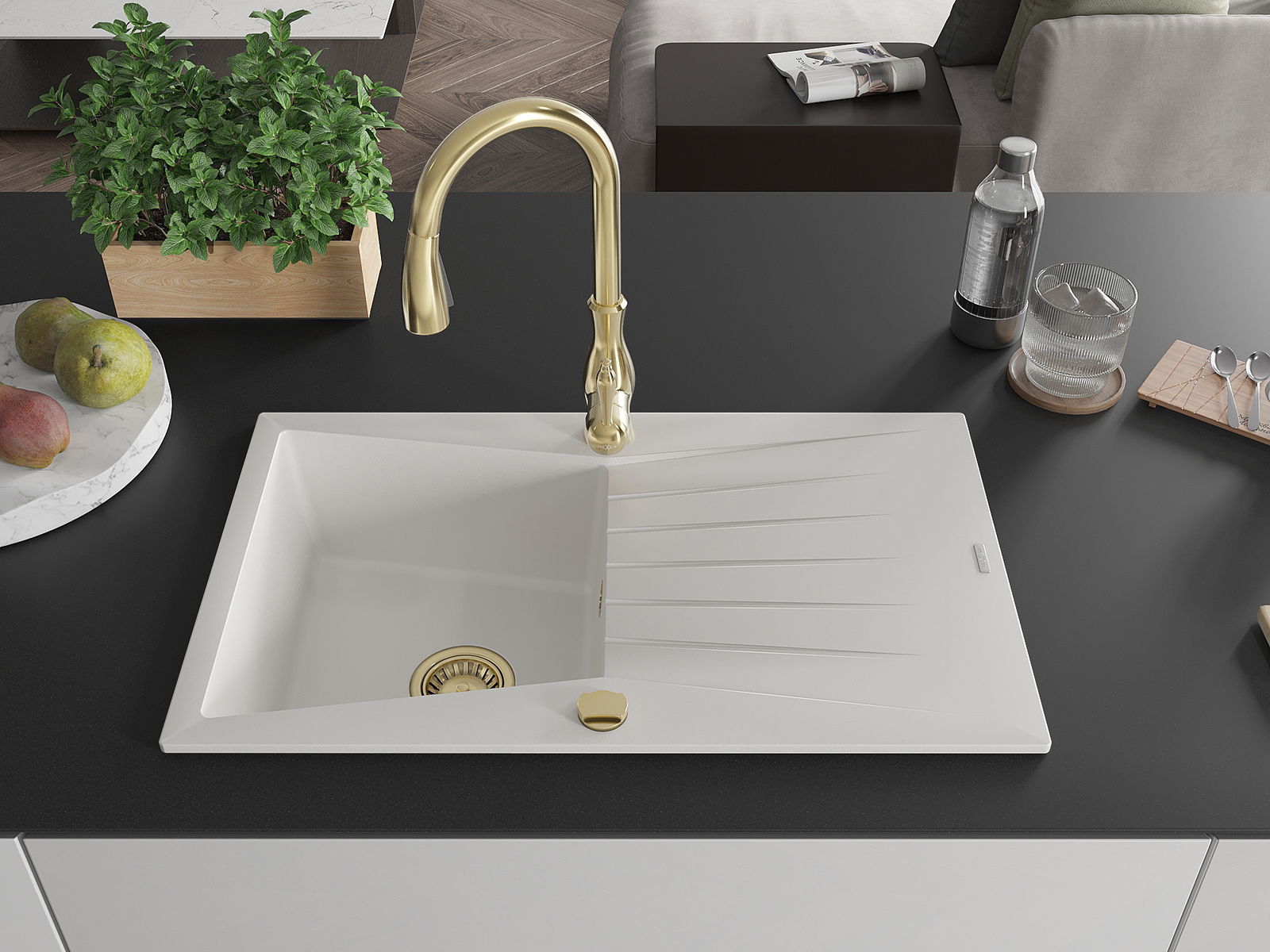 Mexen Cesar chiuvetă din granit cu 1 compartiment cu picurător și robinet de bucătărie Savita, alb - 6514-20-672601-50