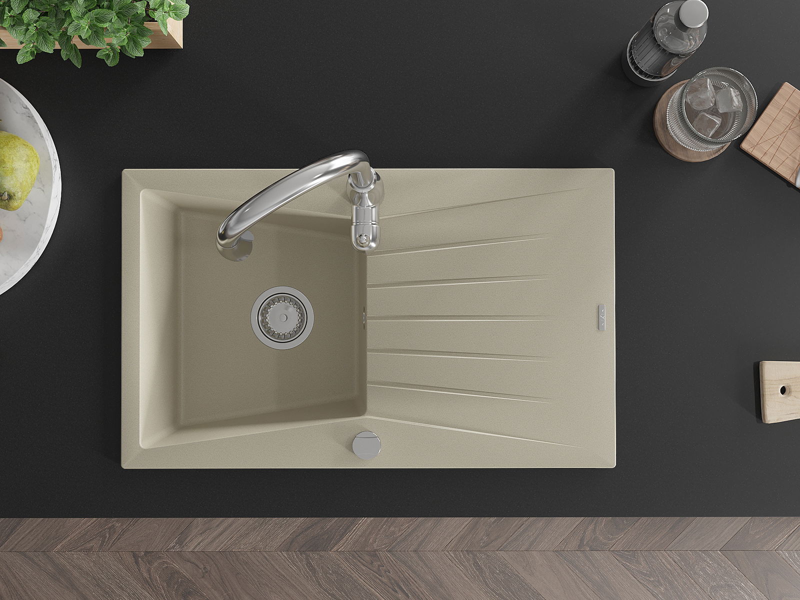 Mexen Cesar chiuvetă de granit cu o cuvă și scurgător, cu baterie de bucătărie Savita, bej - 6514-69-672601-00