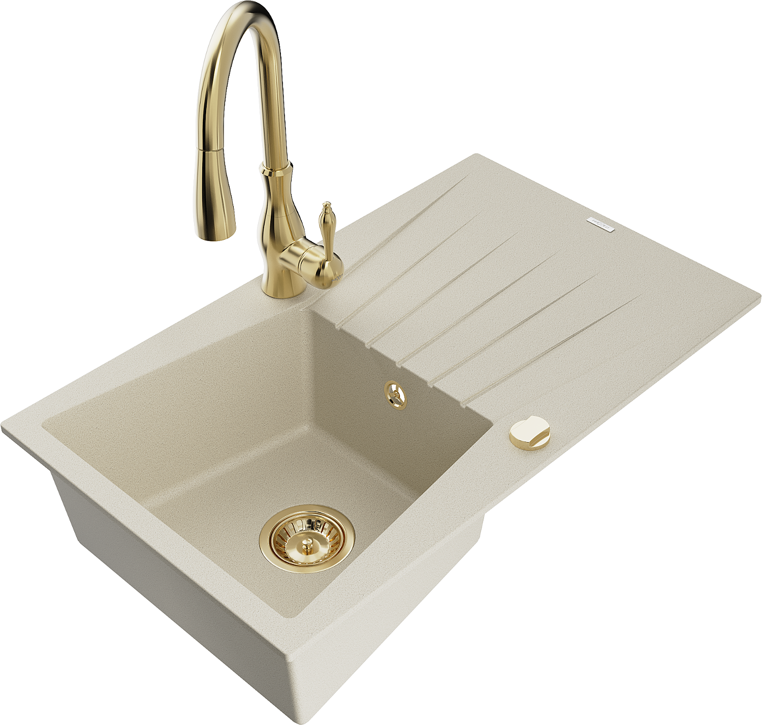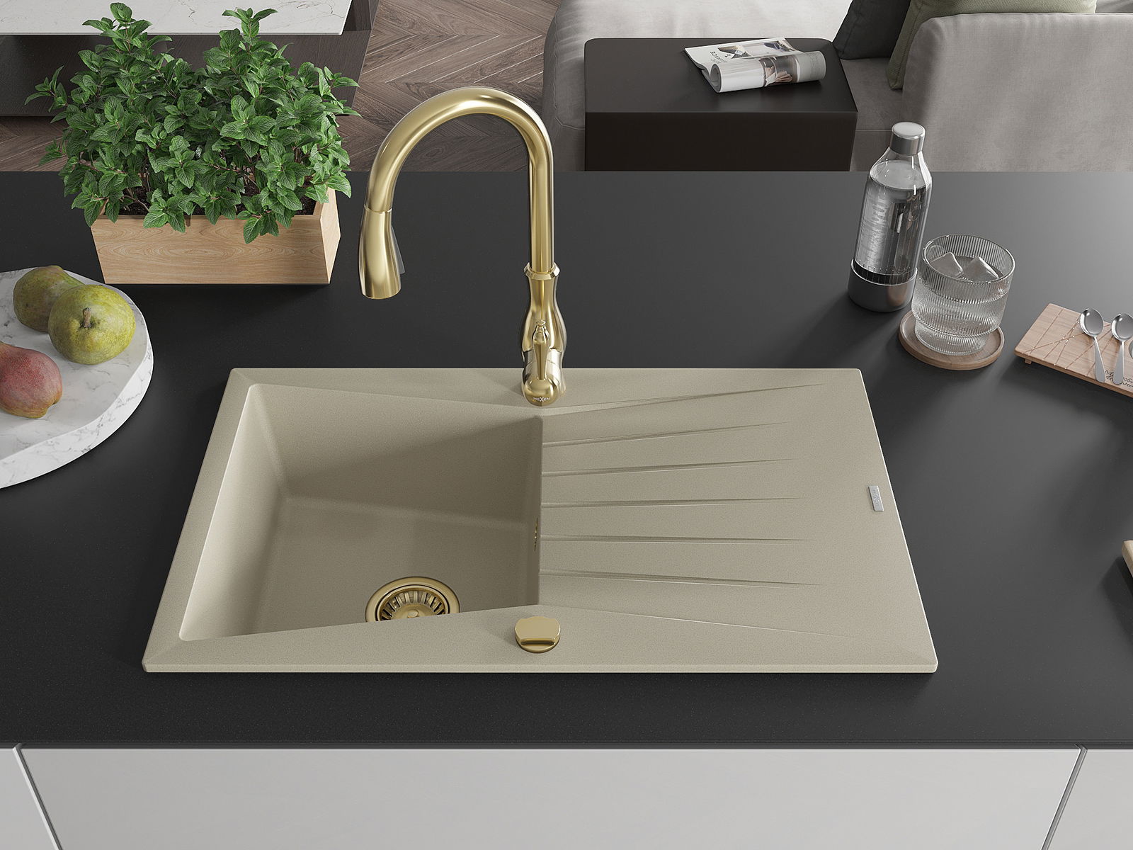 Mexen Cesar chiuvetă de granit 1-cuib cu picurător și baterie de bucătărie Savita, bej - 6514-69-672601-50