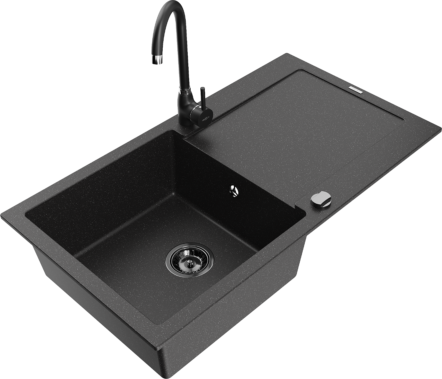 Chiuvetă din granit Mexen Leo cu o cuvă și scurgător și baterie de bucătărie Telma, negru/metal argintiu - 6501-73-670200-70-B