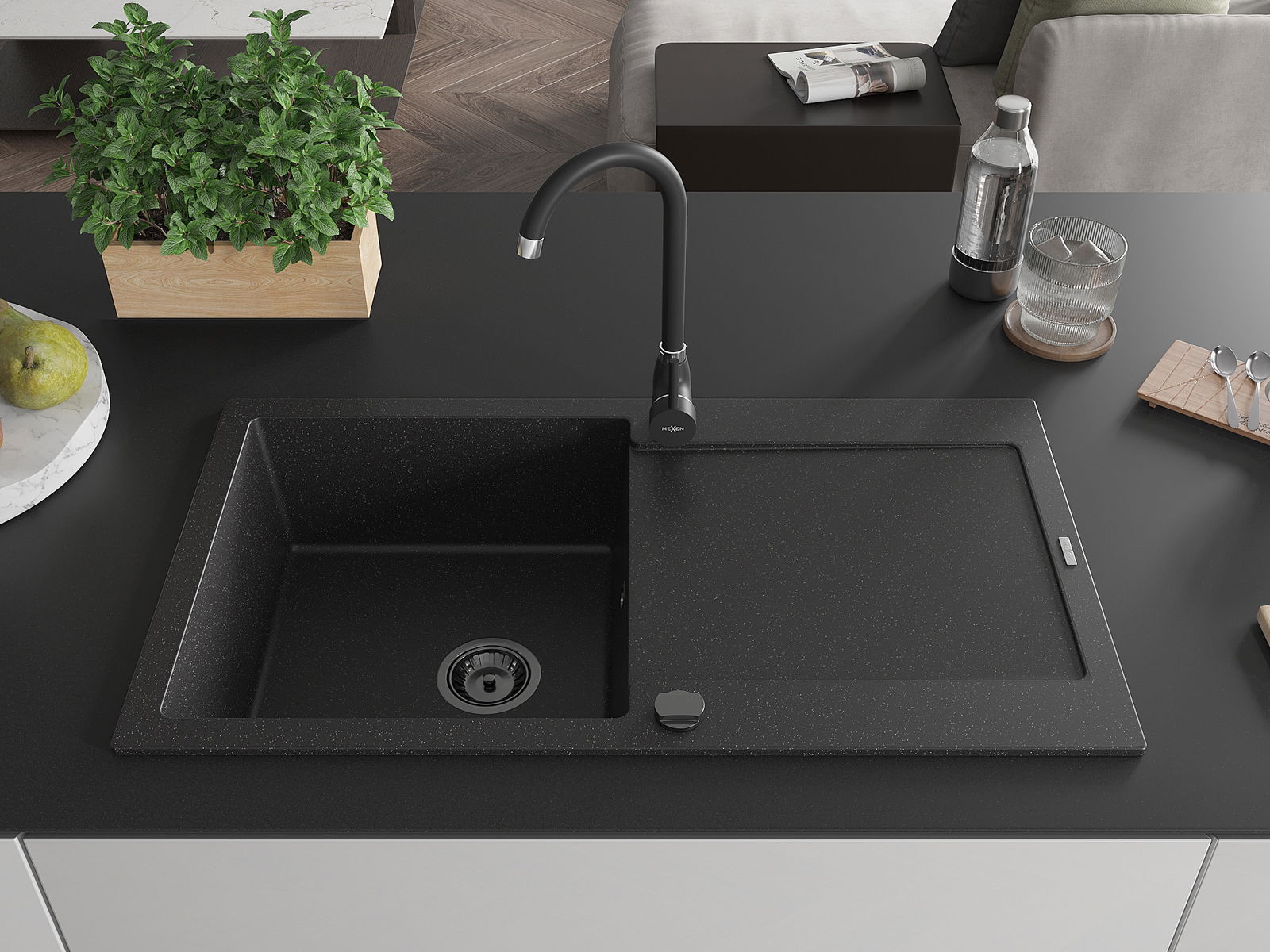Mexen Leo chiuvetă de bucătărie din granit cu 1 compartiment, cu scurgător și baterie de bucătărie Telma, negru/argintiu