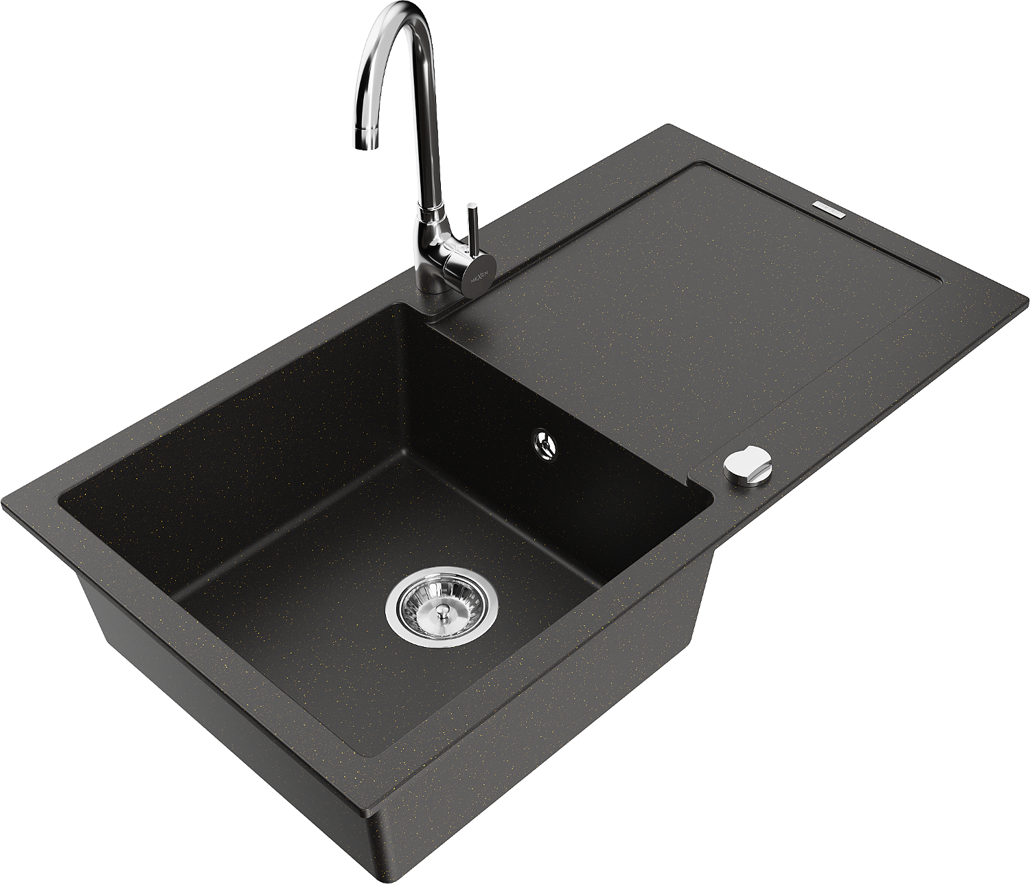 Mexen Leo chiuvetă de granit cu 1 compartiment cu scurgător și baterie de bucătărie Telma, negru/auriu metalic