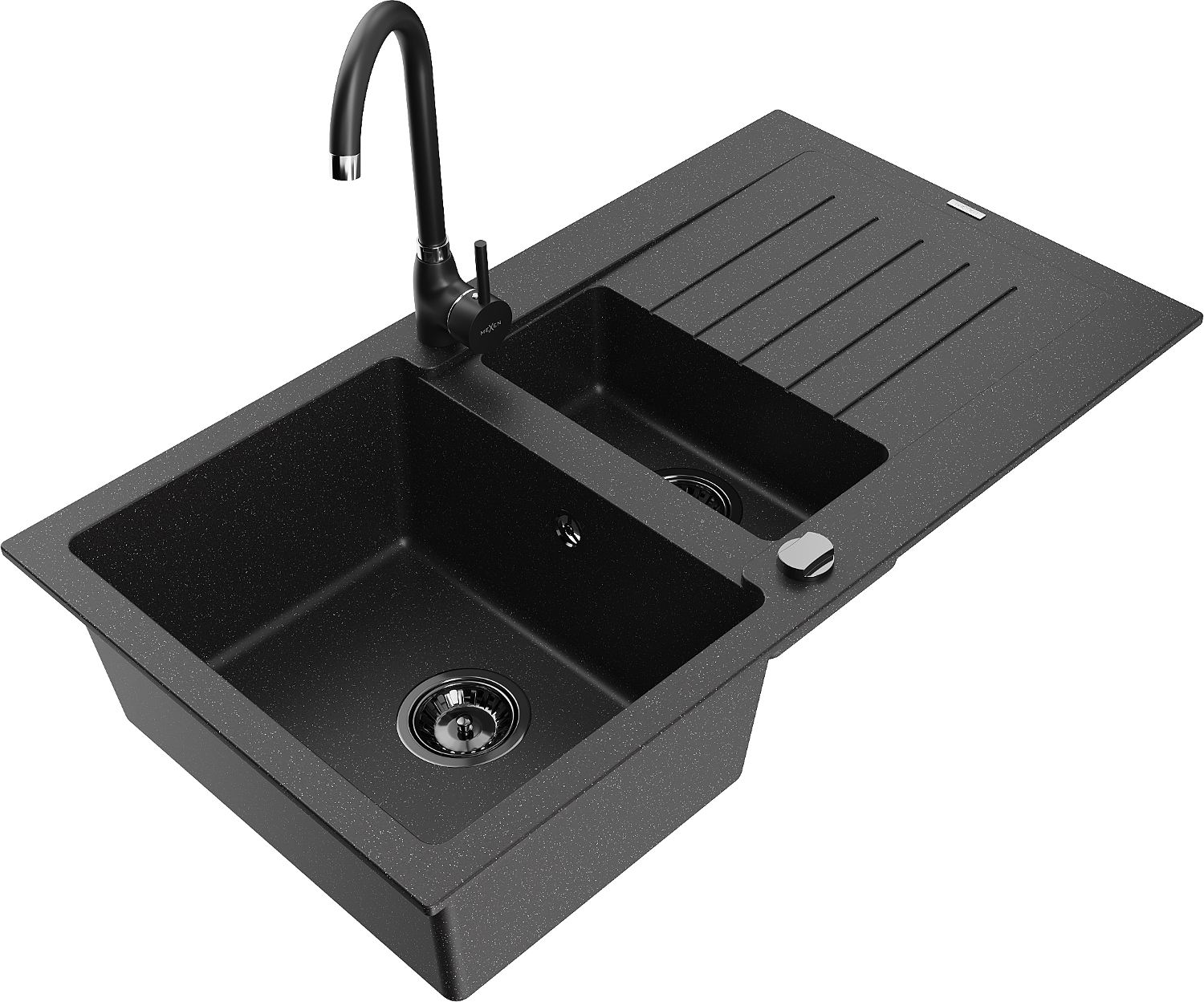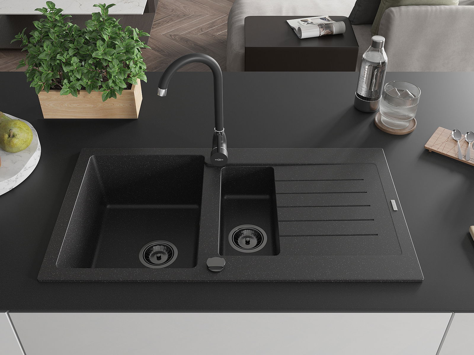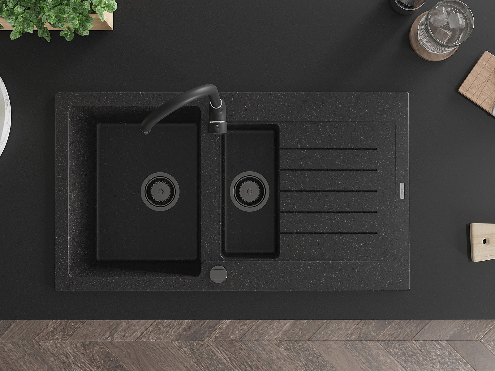 Mexen Matias chiuvetă de granit 1,5-camere cu scurgător și baterie de bucătărie Telma, negru/argintiu - 6502-73-670200-70-B