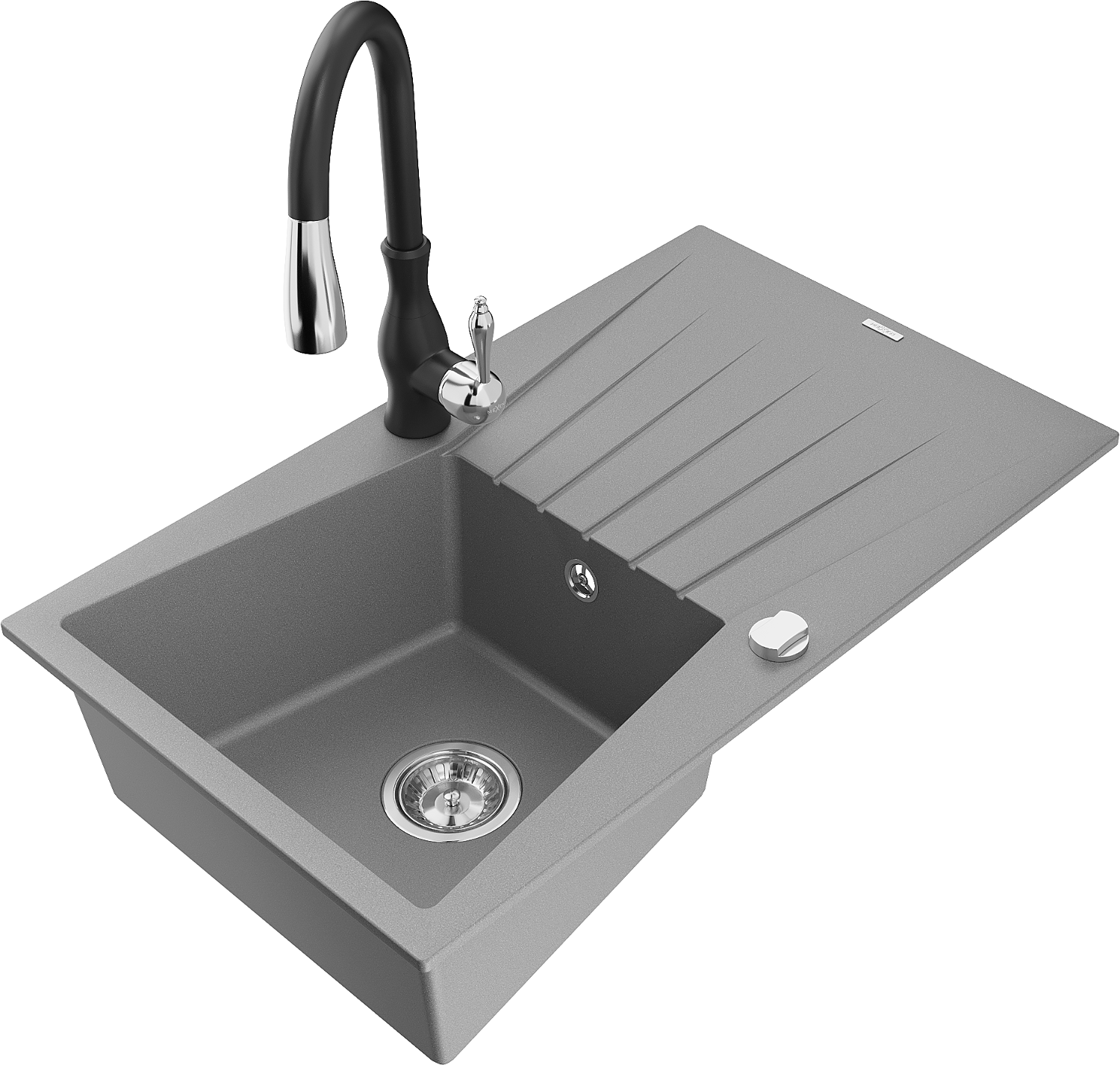 Mexen Cesar chiuvetă granitică cu o cuvă și scurgător și baterie de bucătărie Savita, gri - 6514-71-672601-70