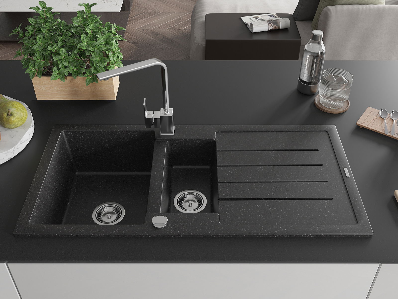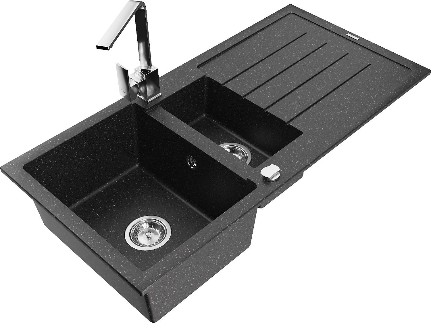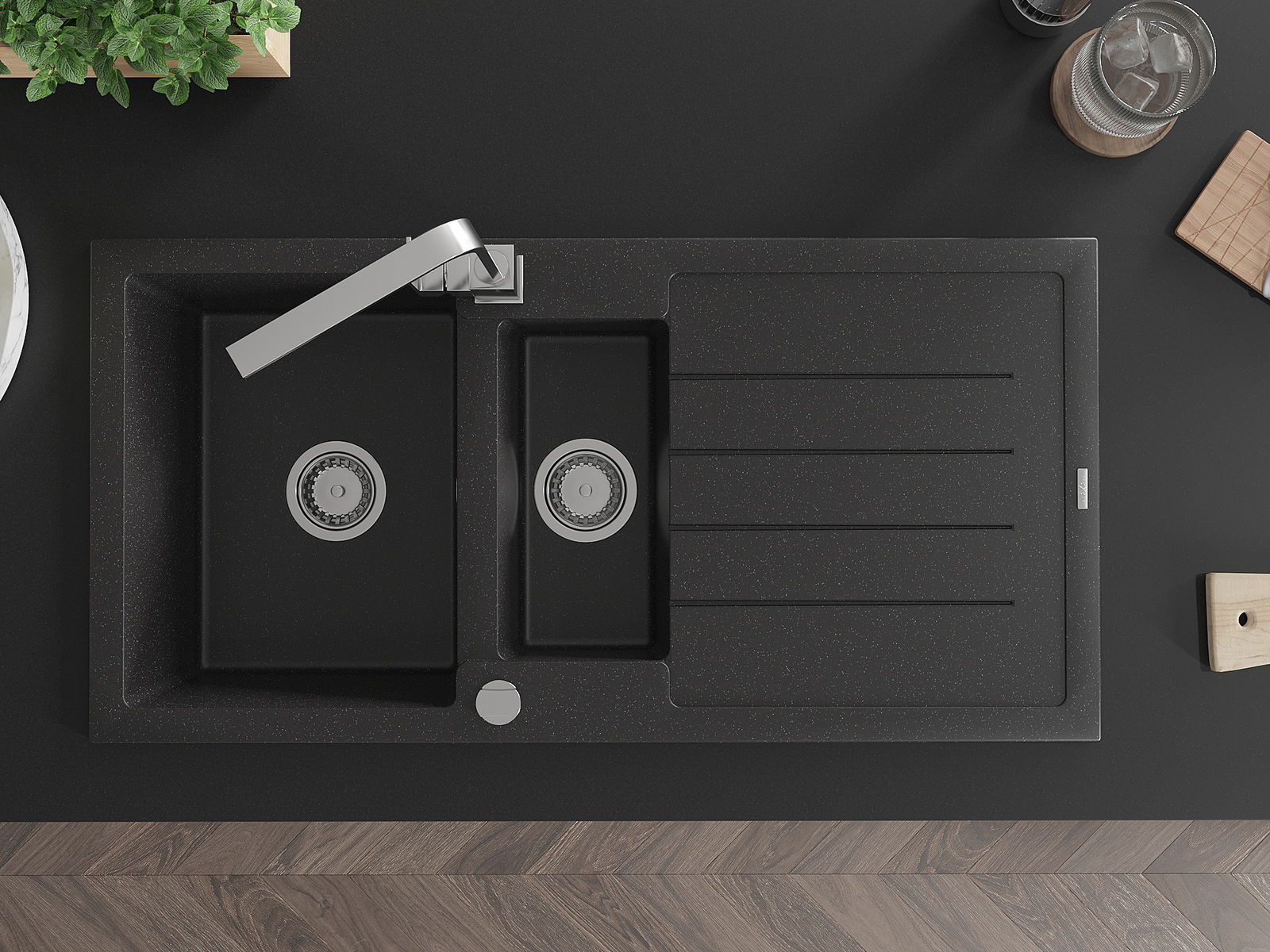Mexen Andres chiuvetă de granit cu 1,5 cuve și picurător și baterie de bucătărie Rita, negru/metal argintiu