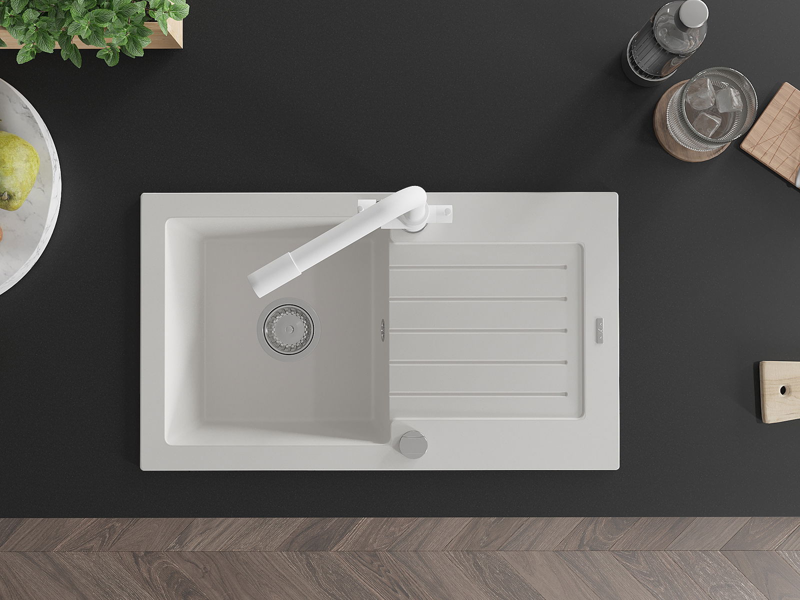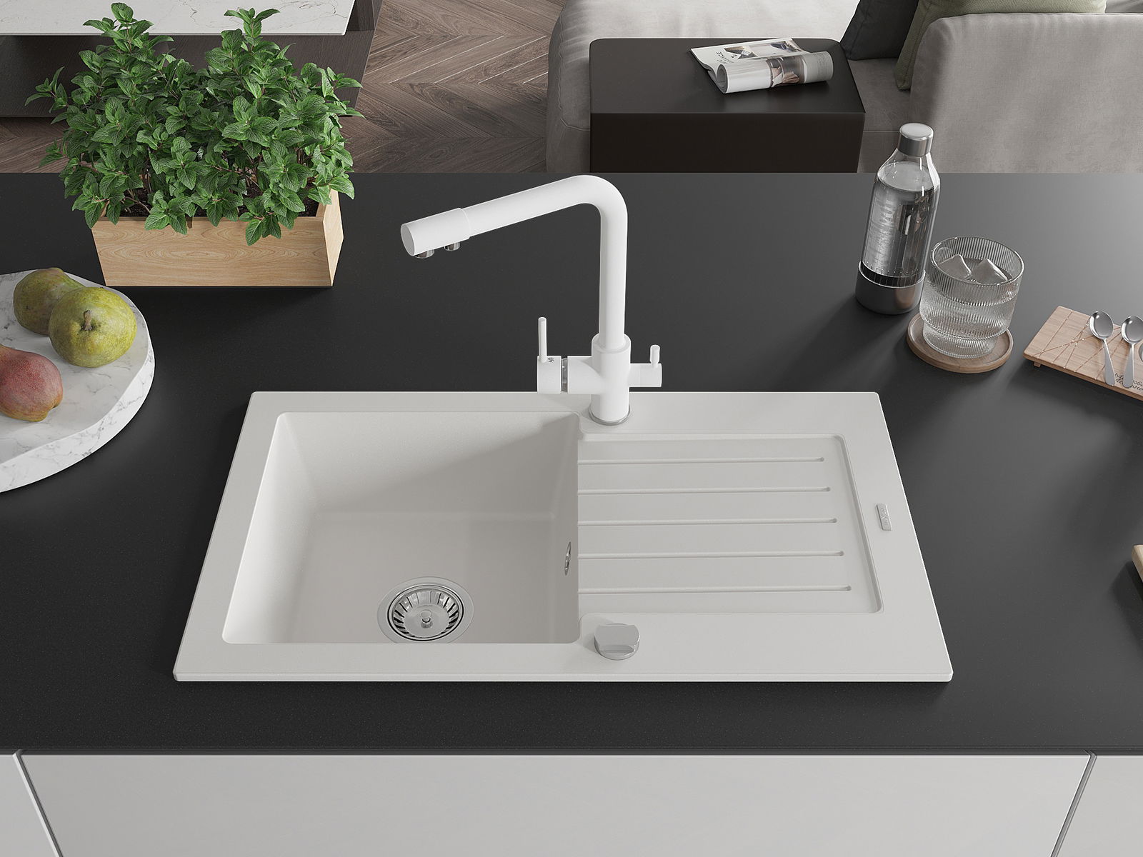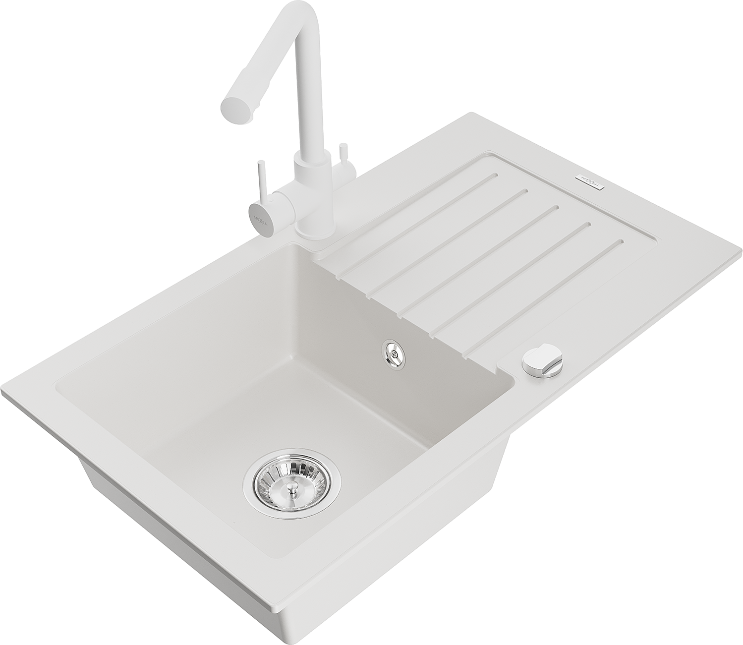 Mexen Pablo chiuvetă de granit cu 1 compartiment cu scurgător și baterie de bucătărie Duero, alb - 6510-20-671600-20