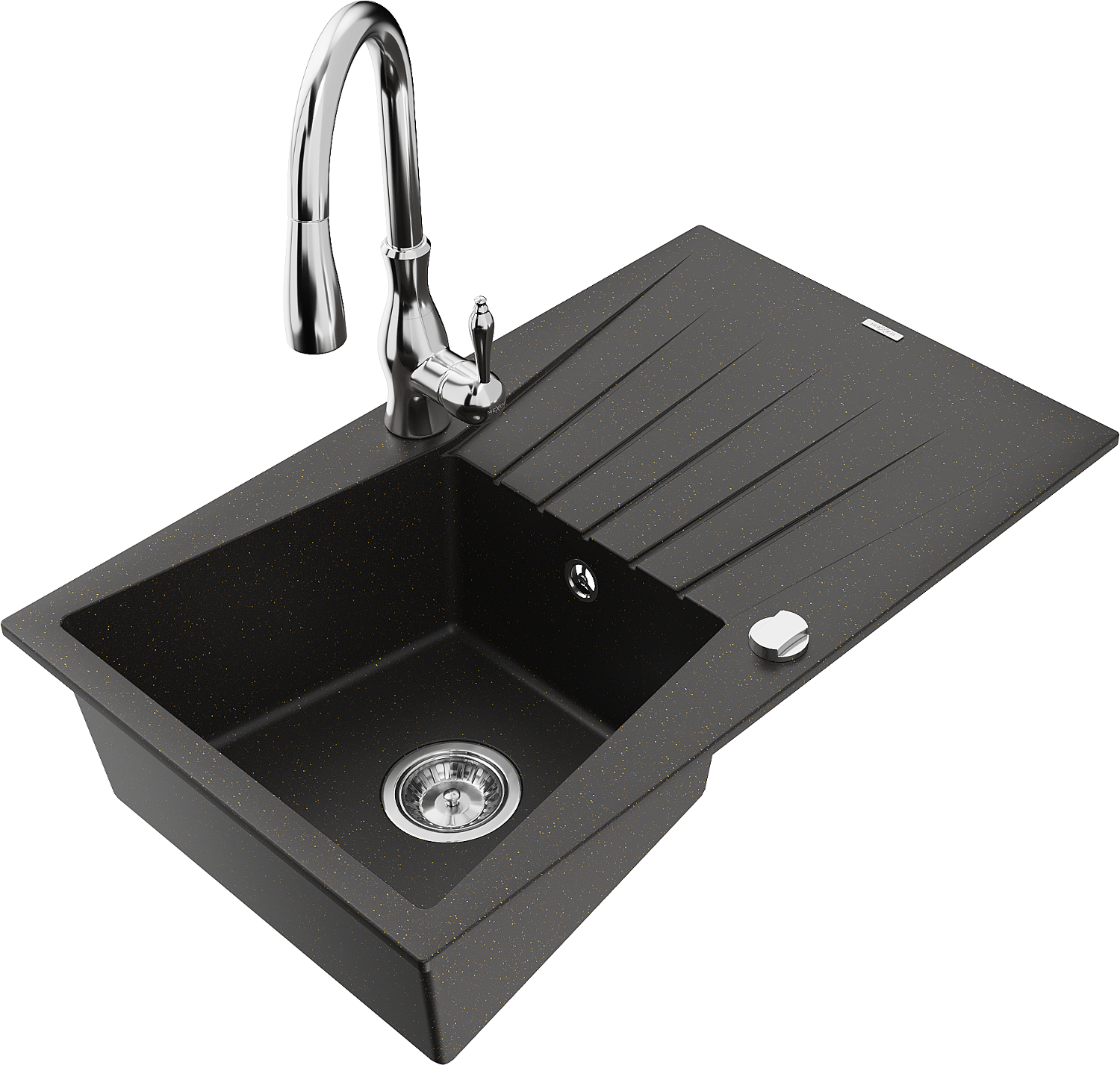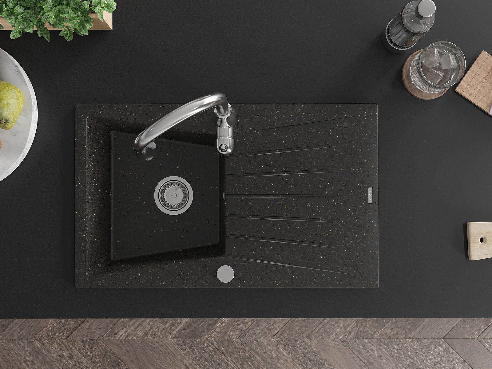 Mexen Cesar chiuvetă de granit cu 1 cuvă cu scurgător și baterie de bucătărie Savita, negru/auriu metalic
