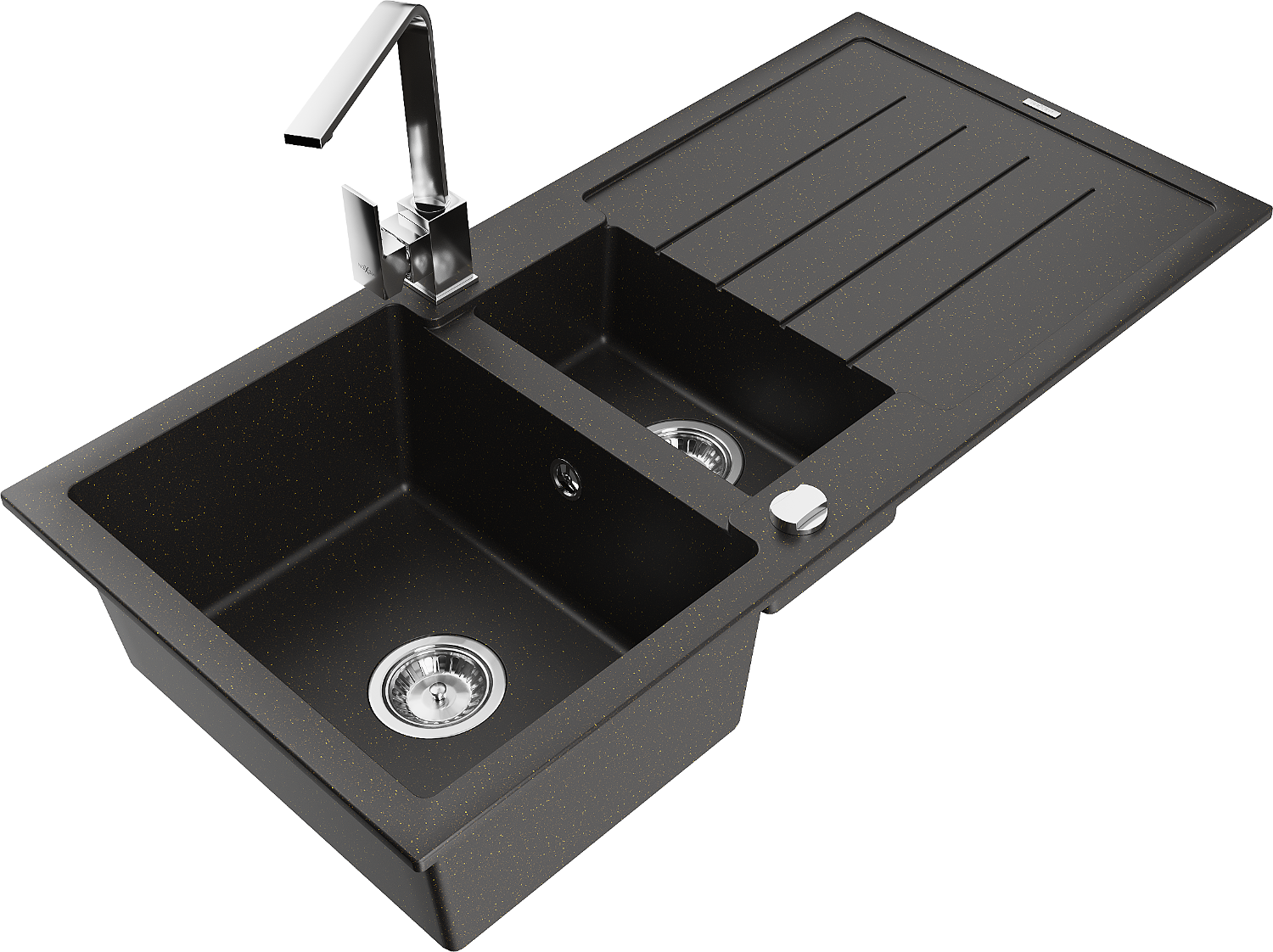 Mexen Andres chiuvetă granit 1,5-camere cu scurgător și baterie de bucătărie Rita, negru/auriu metalic- 6515-75-670300-00