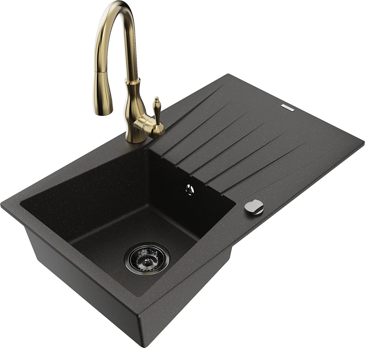 Mexen Cesar chiuvetă de bucătărie din granit cu 1 compartiment cu scurgător și baterie de bucătărie Savita, negru/auriu