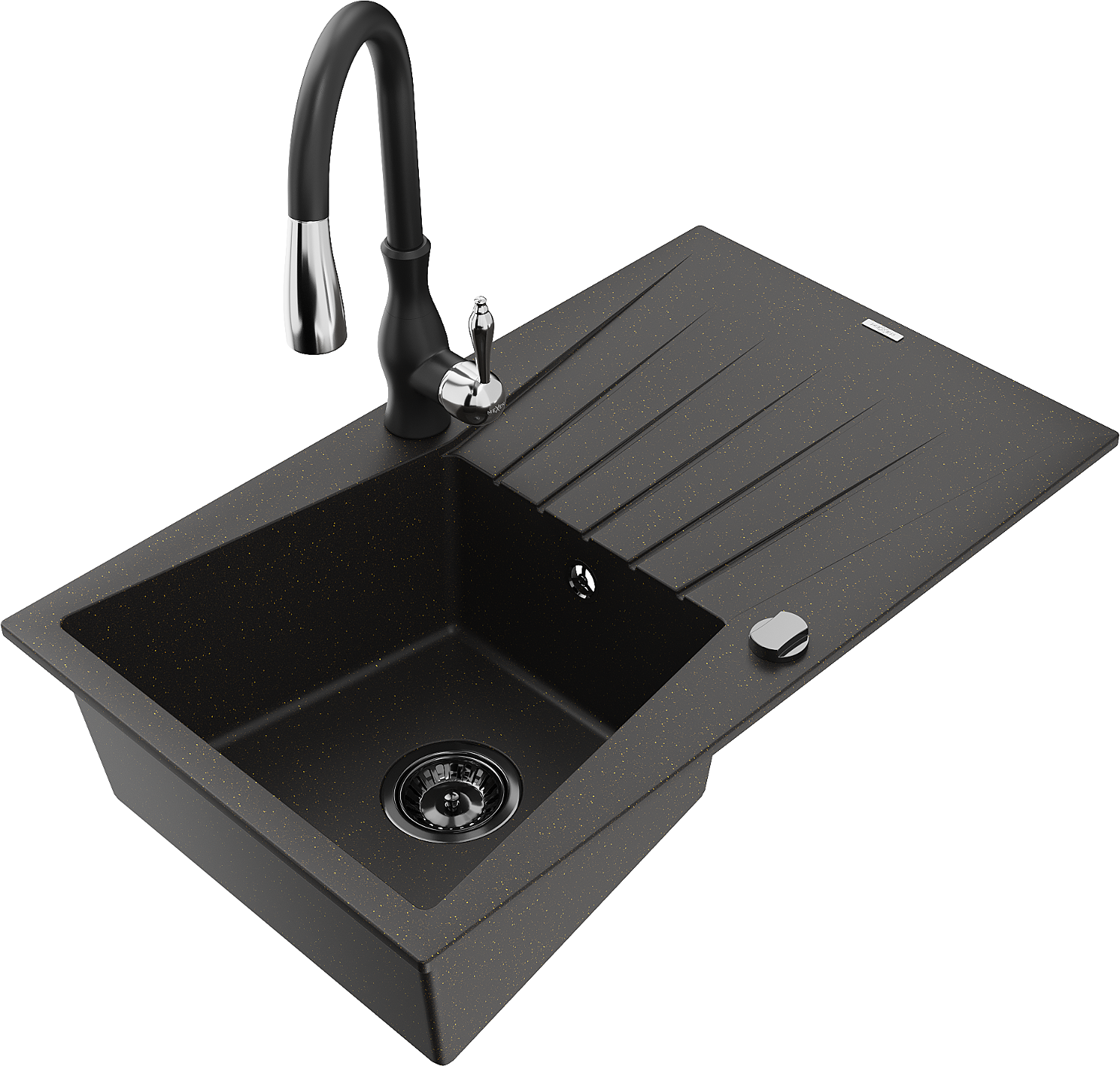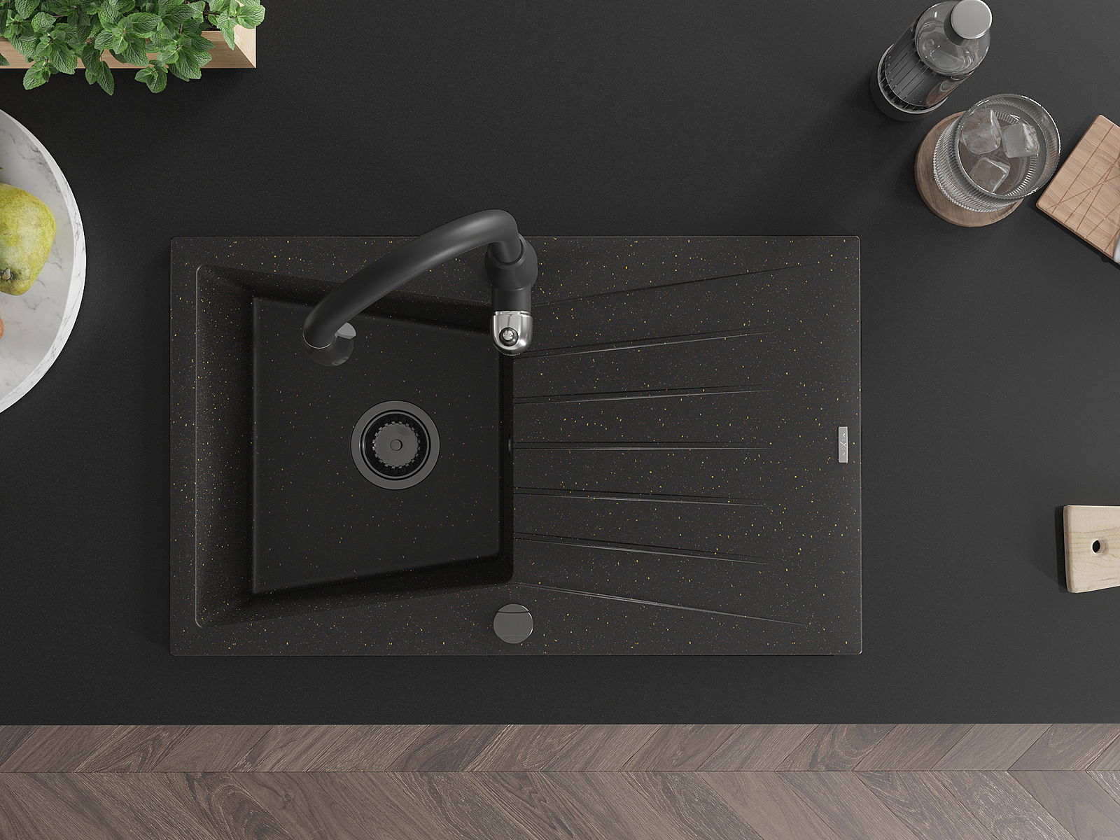 Mexen Cesar chiuvetă din granit cu o cuvă cu scurgător și baterie de bucătărie Savita, negru/auriu metalic