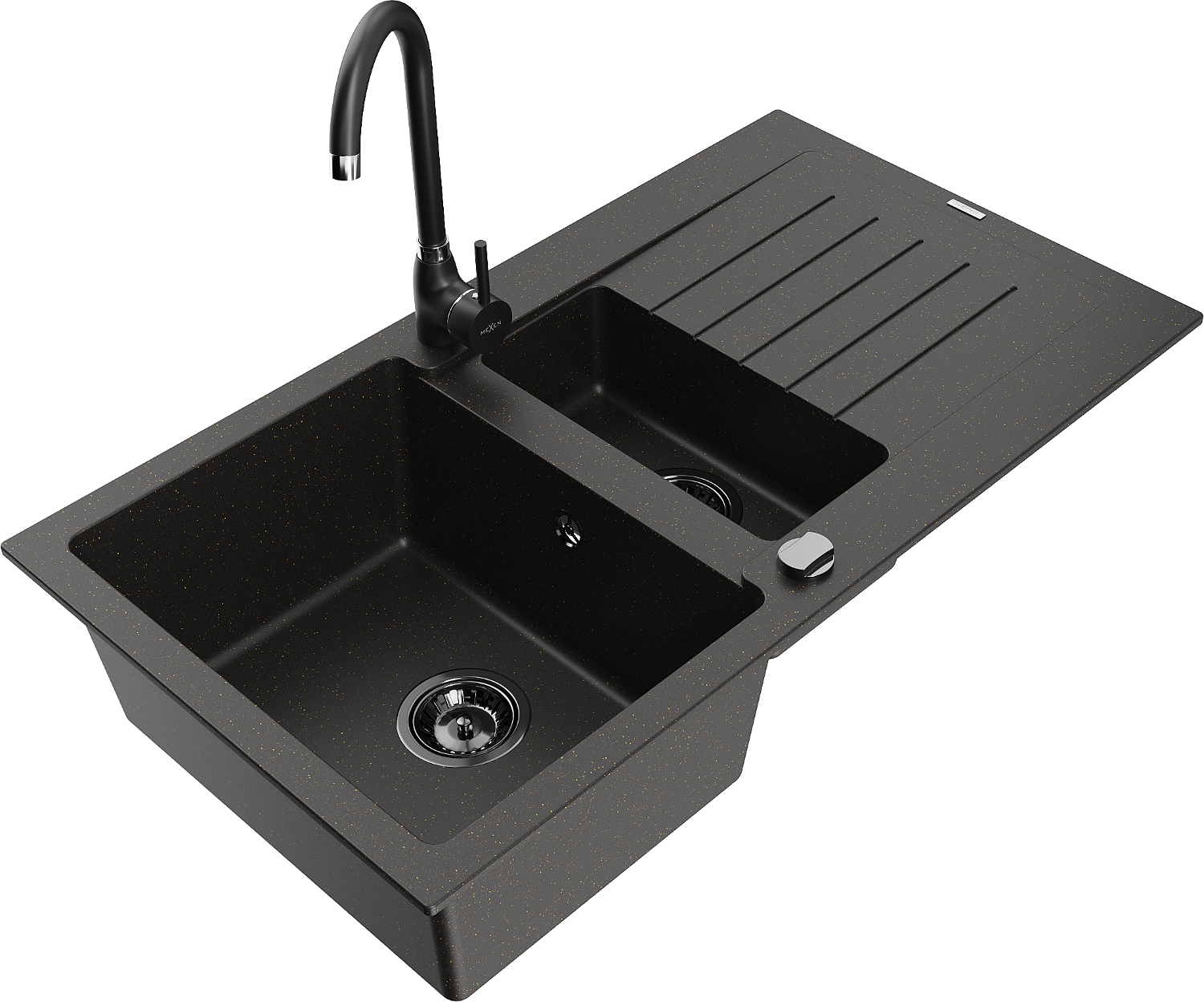 Mexen Matias chiuvetă de granit cu 1,5 cuve cu scurgător și baterie de bucătărie Telma, negru/auriu - 6502-75-670200-70-B