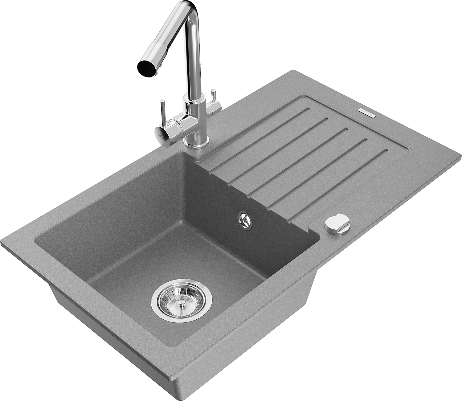 Mexen Pablo chiuvetă de bucătărie din granit cu o cuvă și scurgător și baterie de bucătărie Duero, gri - 6510-71-671600-00