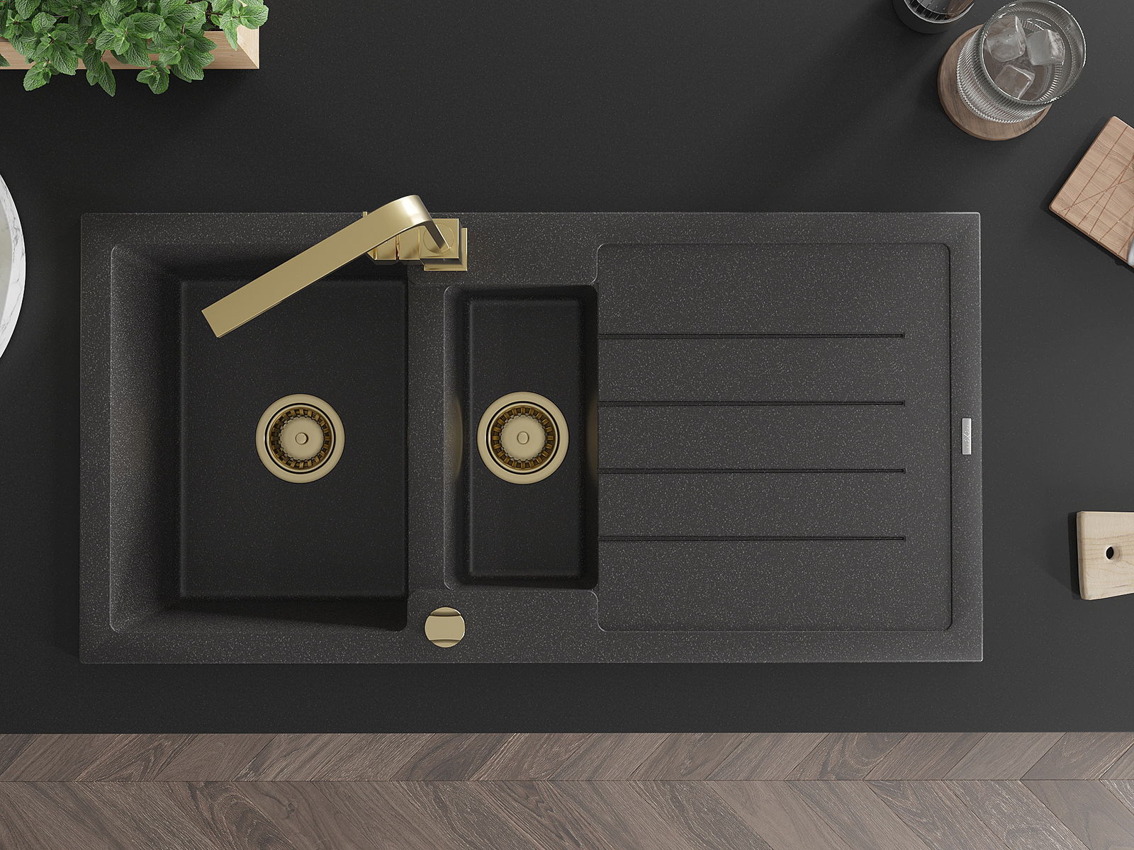 Mexen Andres chiuvetă de bucătărie din granit cu 1,5 cuve, scurgător și baterie Rita, negru cu pete - 6515-76-670300-50