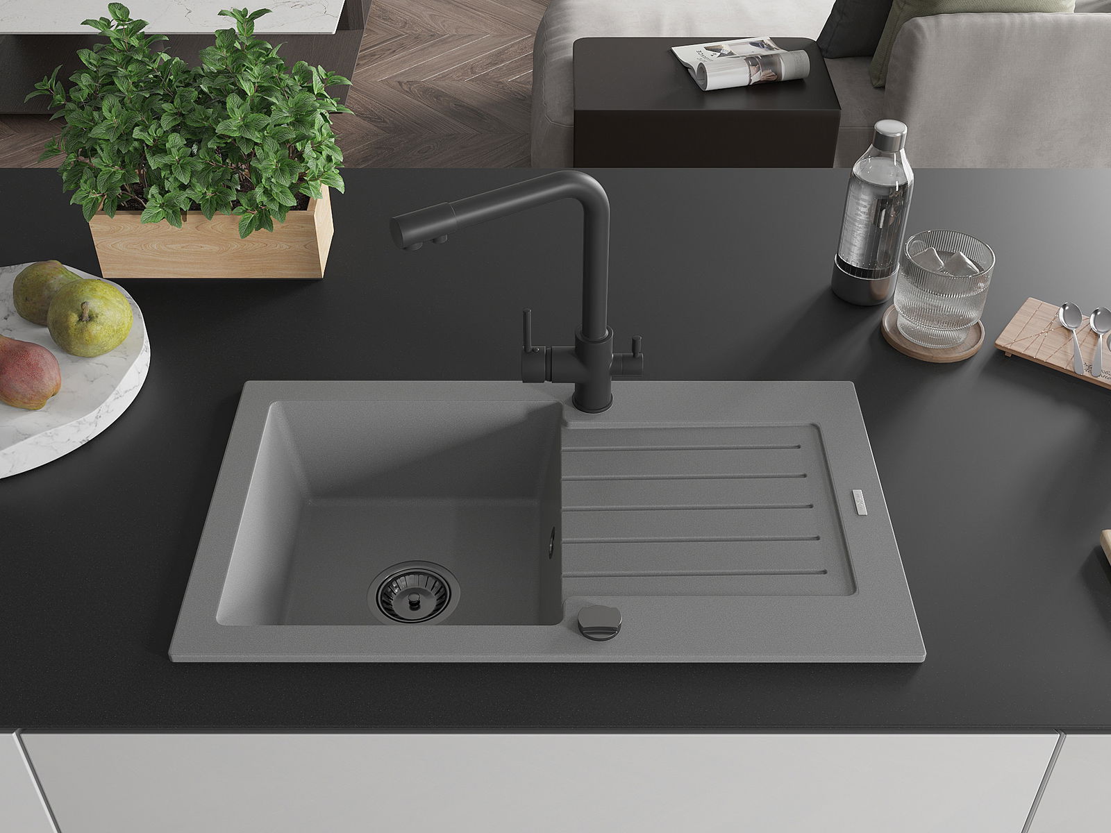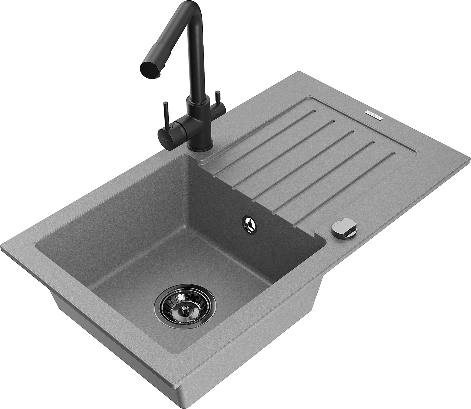 Mexen Pablo chiuvetă din granit cu 1 cuvă și scurgător și baterie de bucătărie Duero, gri - 6510-71-671600-70-B