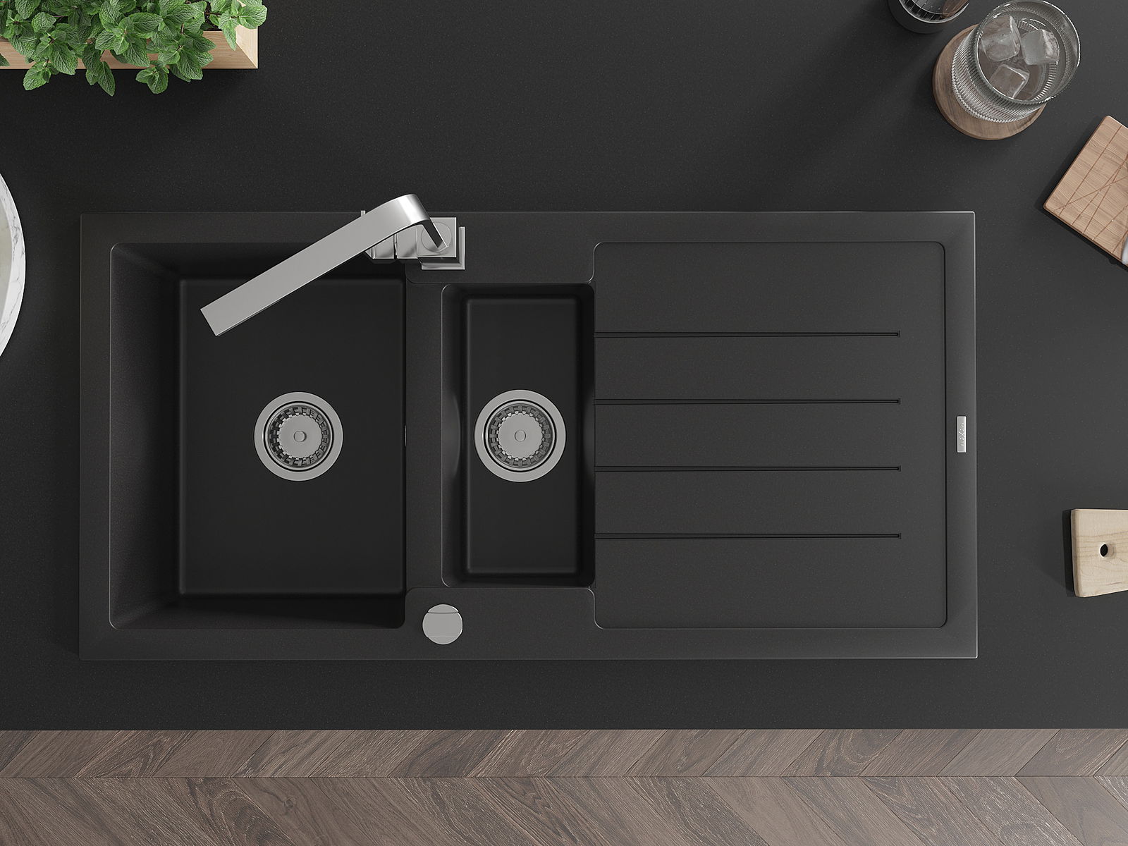 Mexen Andres chiuvetă de granit cu 1,5 compartimente cu scurgător și baterie de bucătărie Rita, negru - 6515-77-670300-00