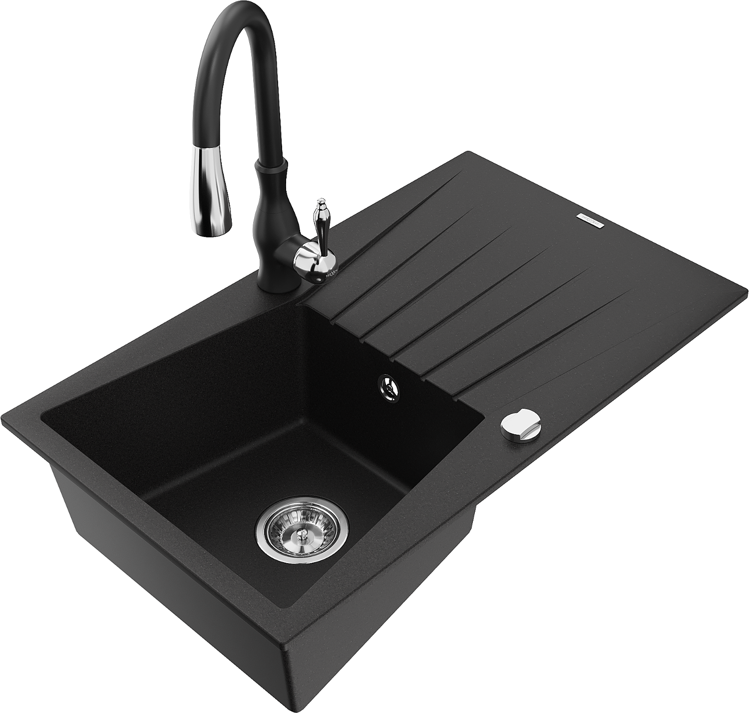 Mexen Cesar chiuvetă din granit cu 1 compartiment, cu scurgător și baterie de bucătărie Savita, negru - 6514-77-672601-70