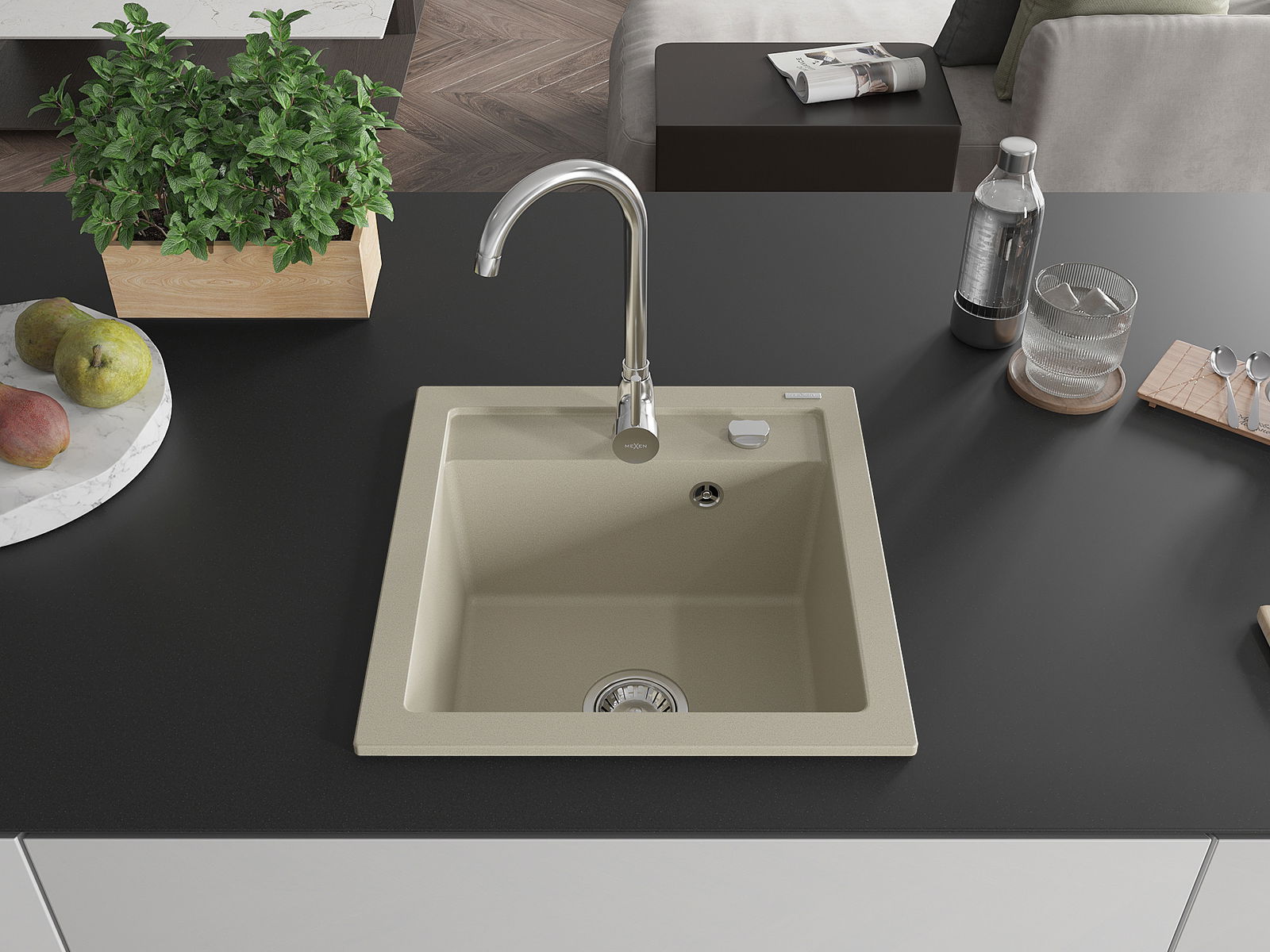 Suprafața chiuvetei este rezistentă la pete și decolorarea, datorită căreia este ușor de curățat și își păstrează culoarea mult timp. Estetică și practic completarea fiecărei bucătării.