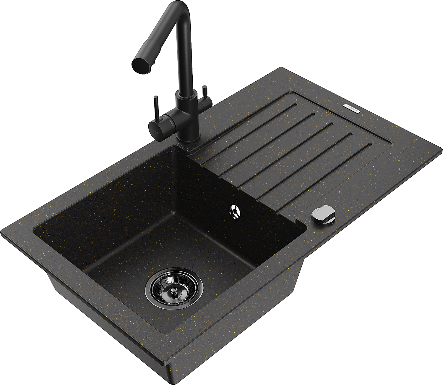 Mexen Pablo chiuvetă din granit cu o cuvă și picurător și baterie de bucătărie Duero, negru/auriu metalizat