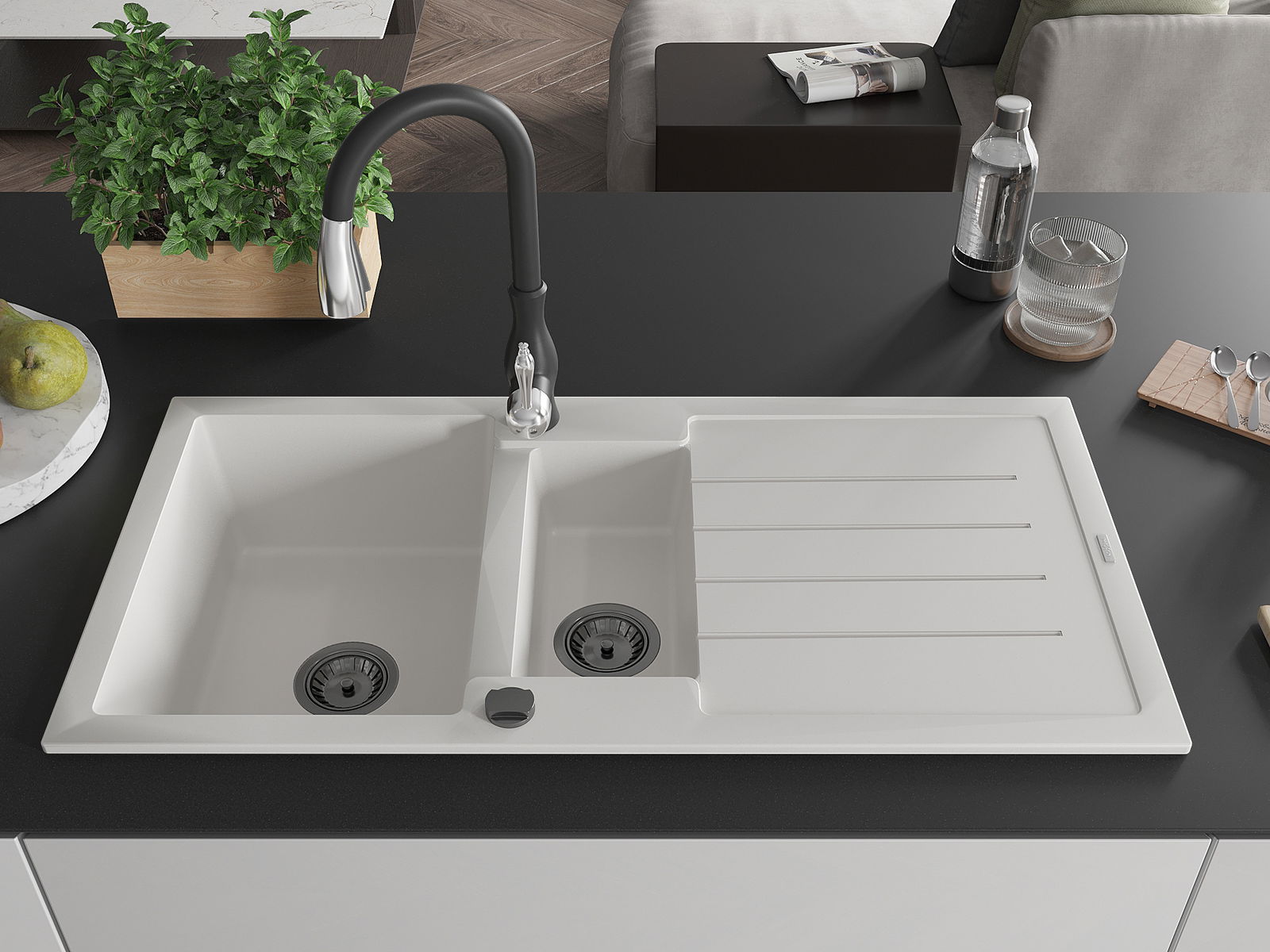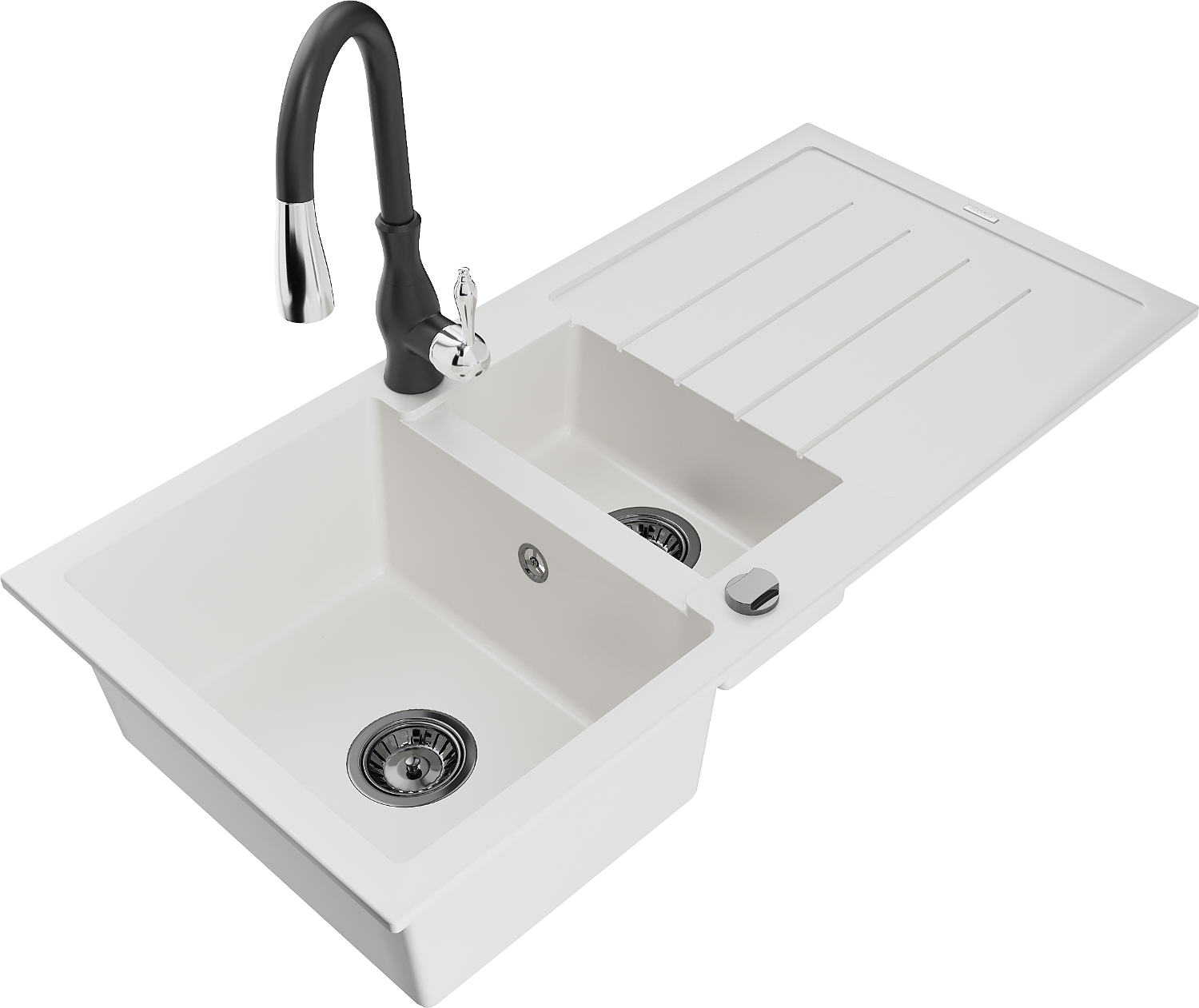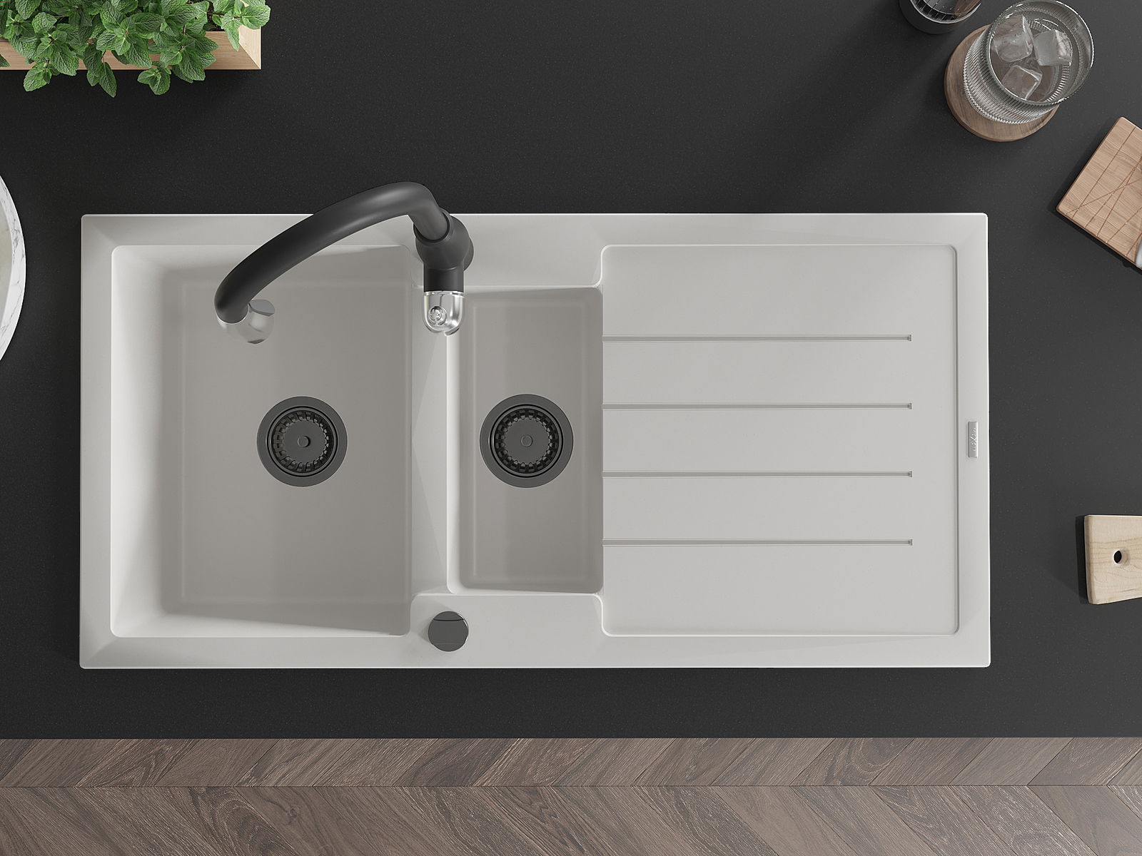Mexen Andres chiuvetă din granit cu 1,5 compartimente cu picurător și baterie de bucătărie Savita, alb - 6515-20-672601-70