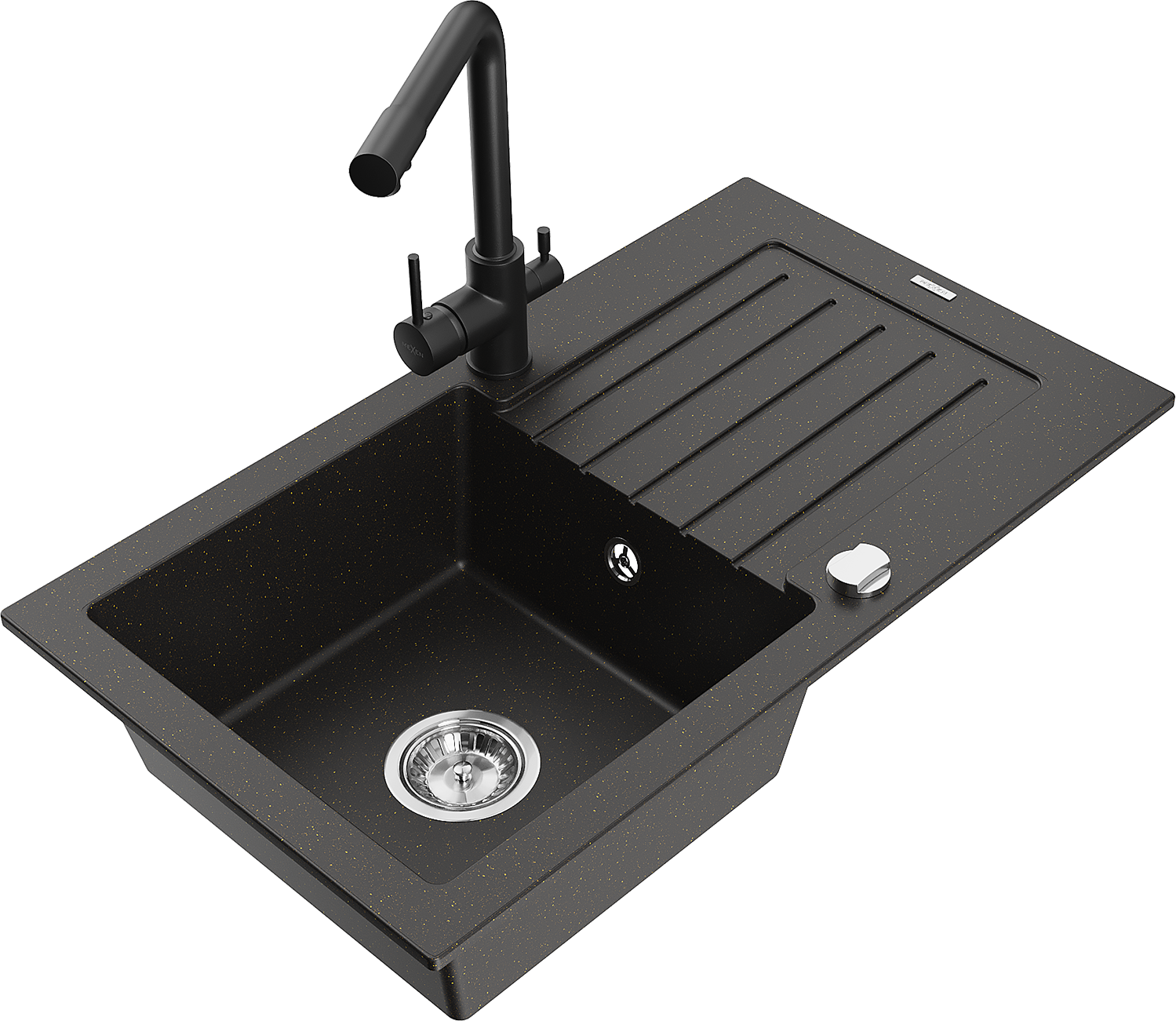 Mexen Pablo chiuvetă de granit cu o singură cuvă cu picurător și baterie de bucătărie Duero, negru/auriu metalizat