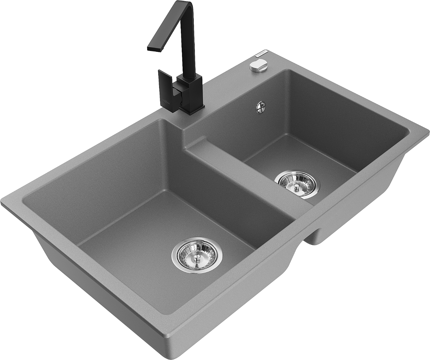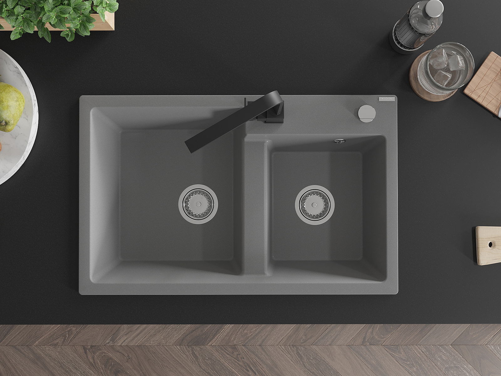 Mexen Tomas chiuvetă de bucătărie din granit cu 2 compartimente și baterie Rita, gri - 6516-71-670300-70