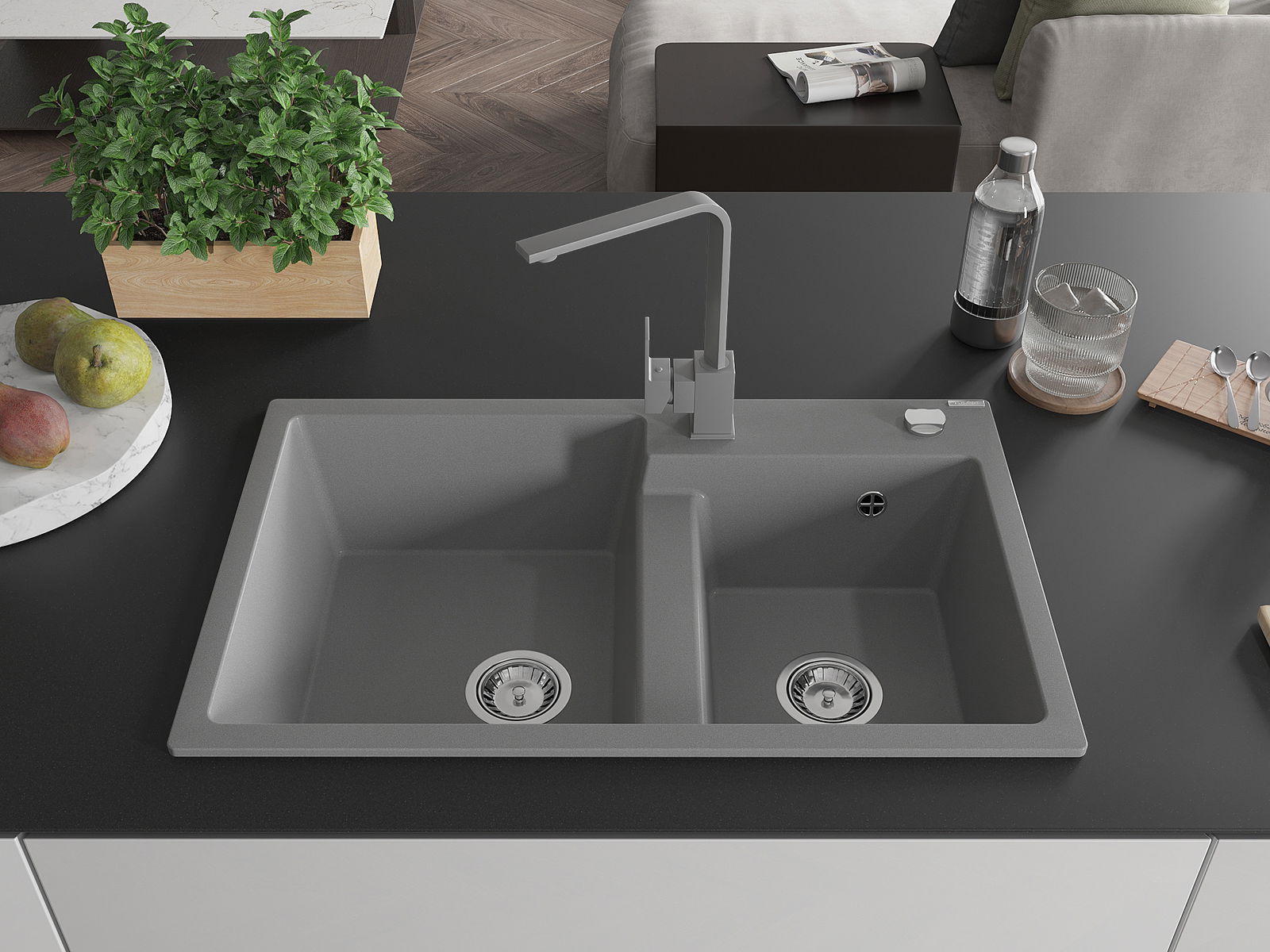 Mexen Tomas chiuvetă de bucătărie din granit cu 2 compartimente și robinet Rita, gri - 6516-71-670300-71