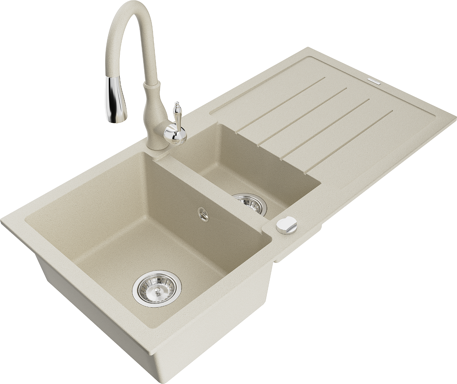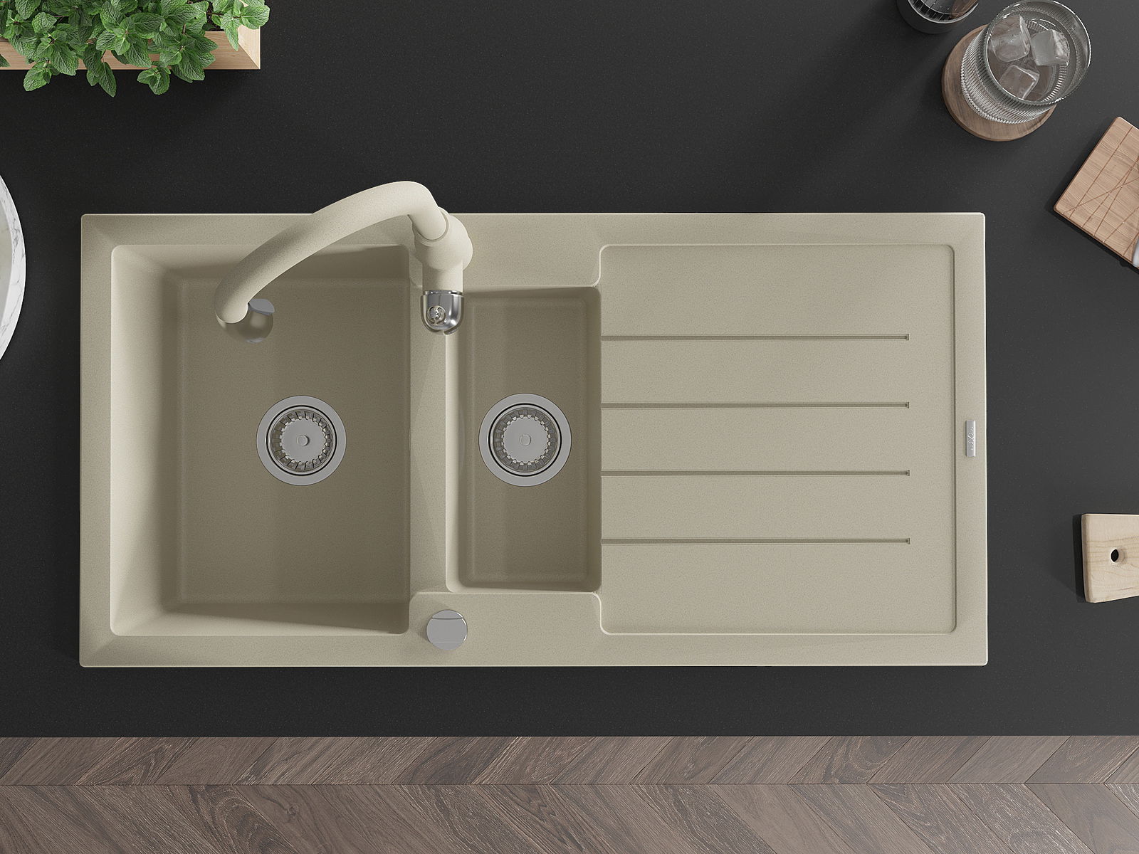 Mexen Andres chiuvetă de granit cu 1,5 cuve cu scurgător și baterie de bucătărie Savita, bej - 6515-69-672601-69