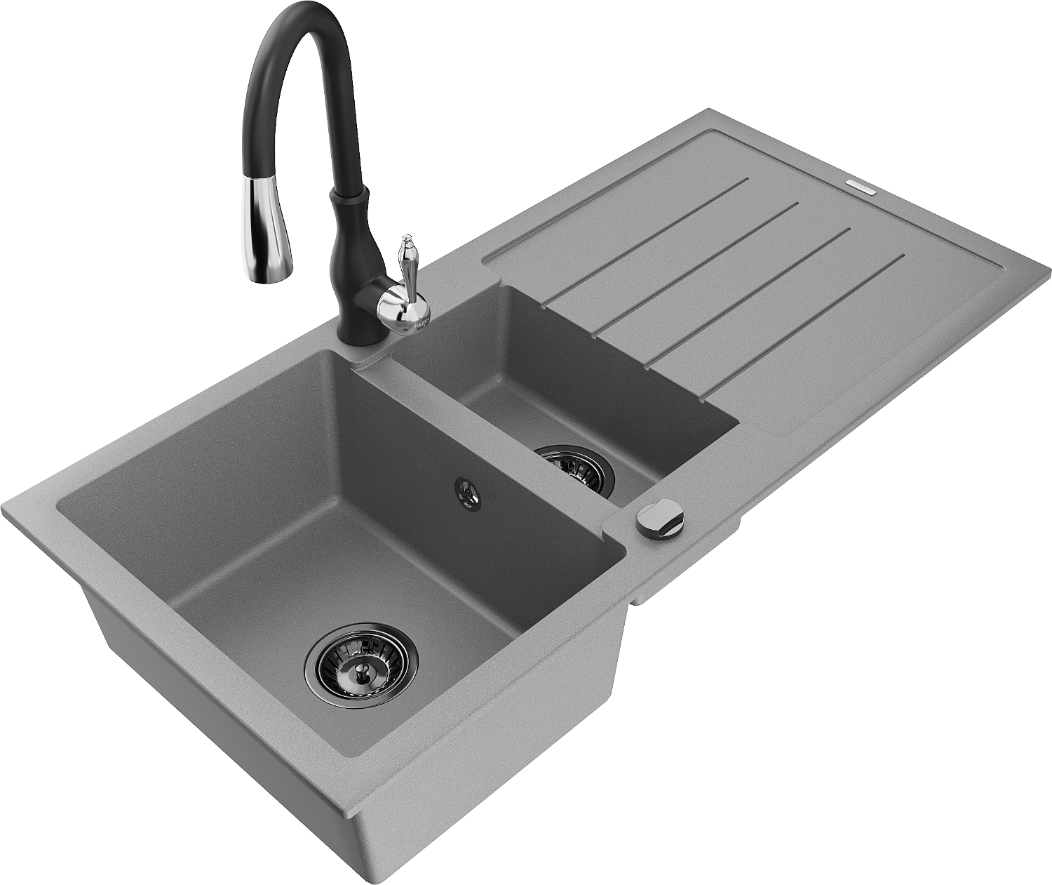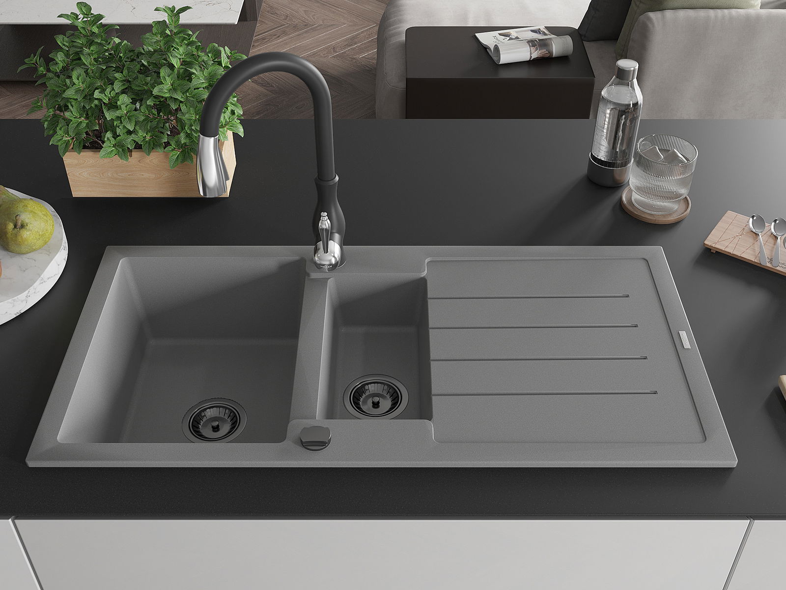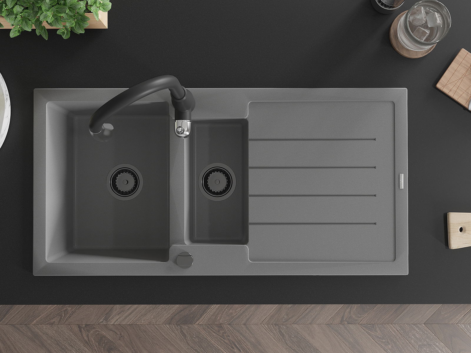 Mexen Andres chiuvetă din granit cu 1,5 camere cu scurgător și baterie de bucătărie Savita, gri - 6515-71-672601-70-B