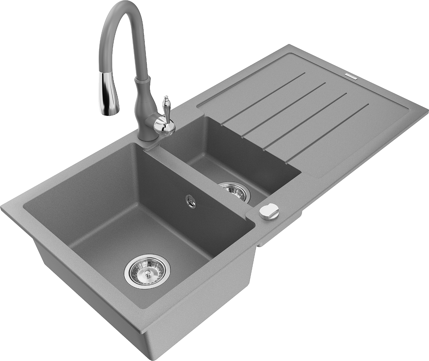 Mexen Andres chiuvetă de granit cu 1,5 compartimente cu scurgător și baterie de bucătărie Savita, gri - 6515-71-672601-71