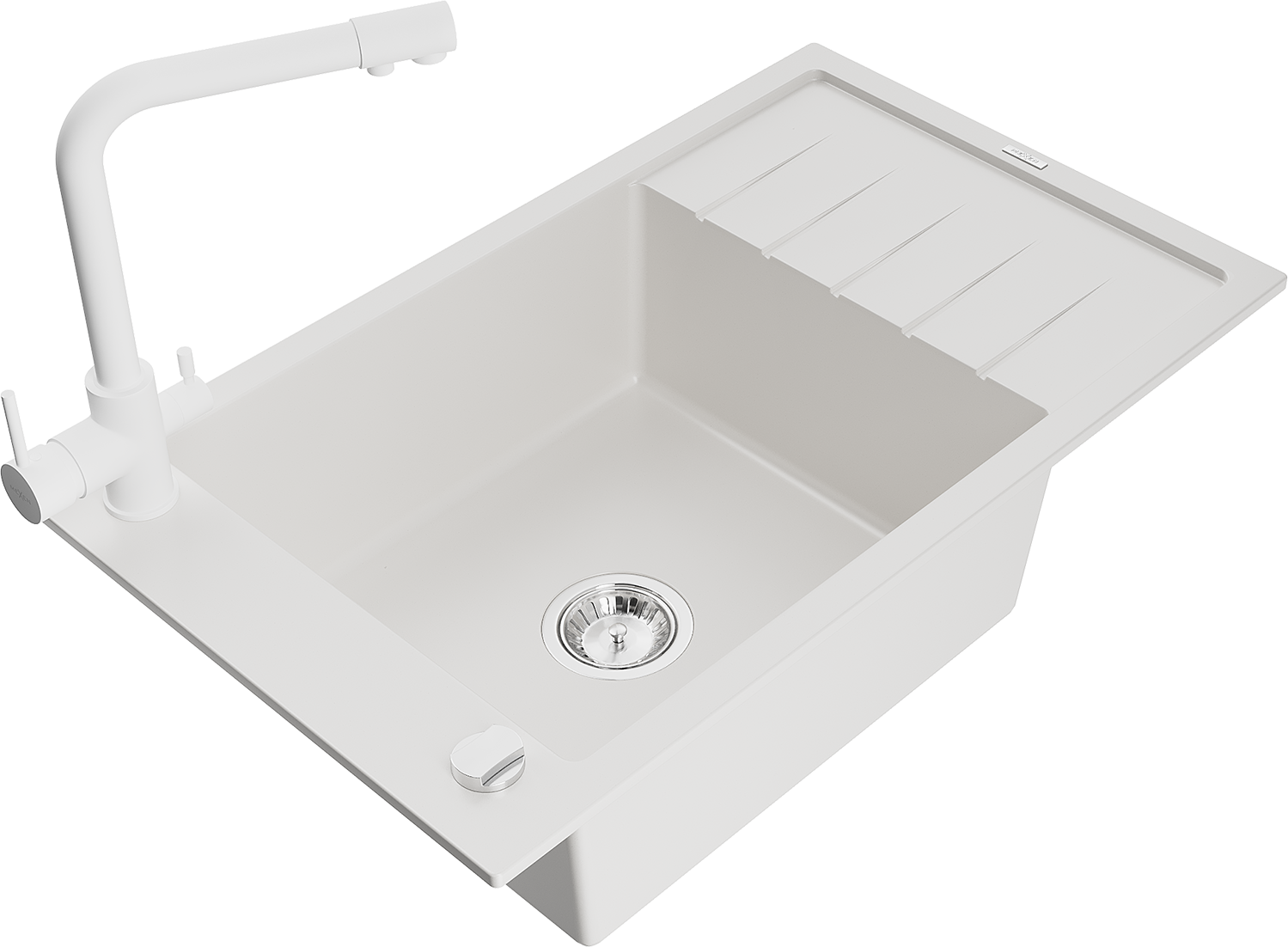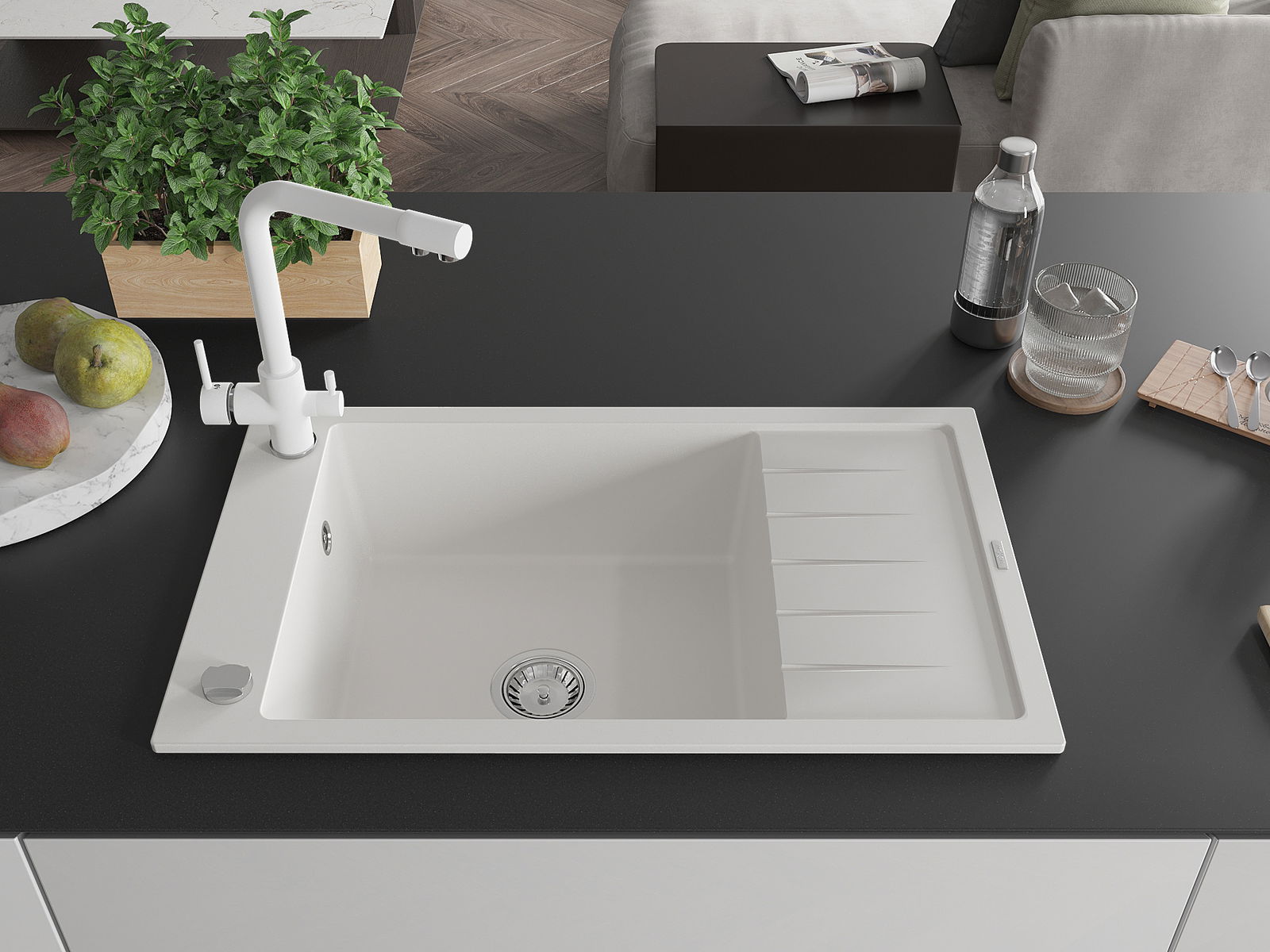 Mexen Elias chiuvetă de bucătărie din granit cu 1 compartiment cu picurător și baterie Duero, alb - 6511-20-671600-20