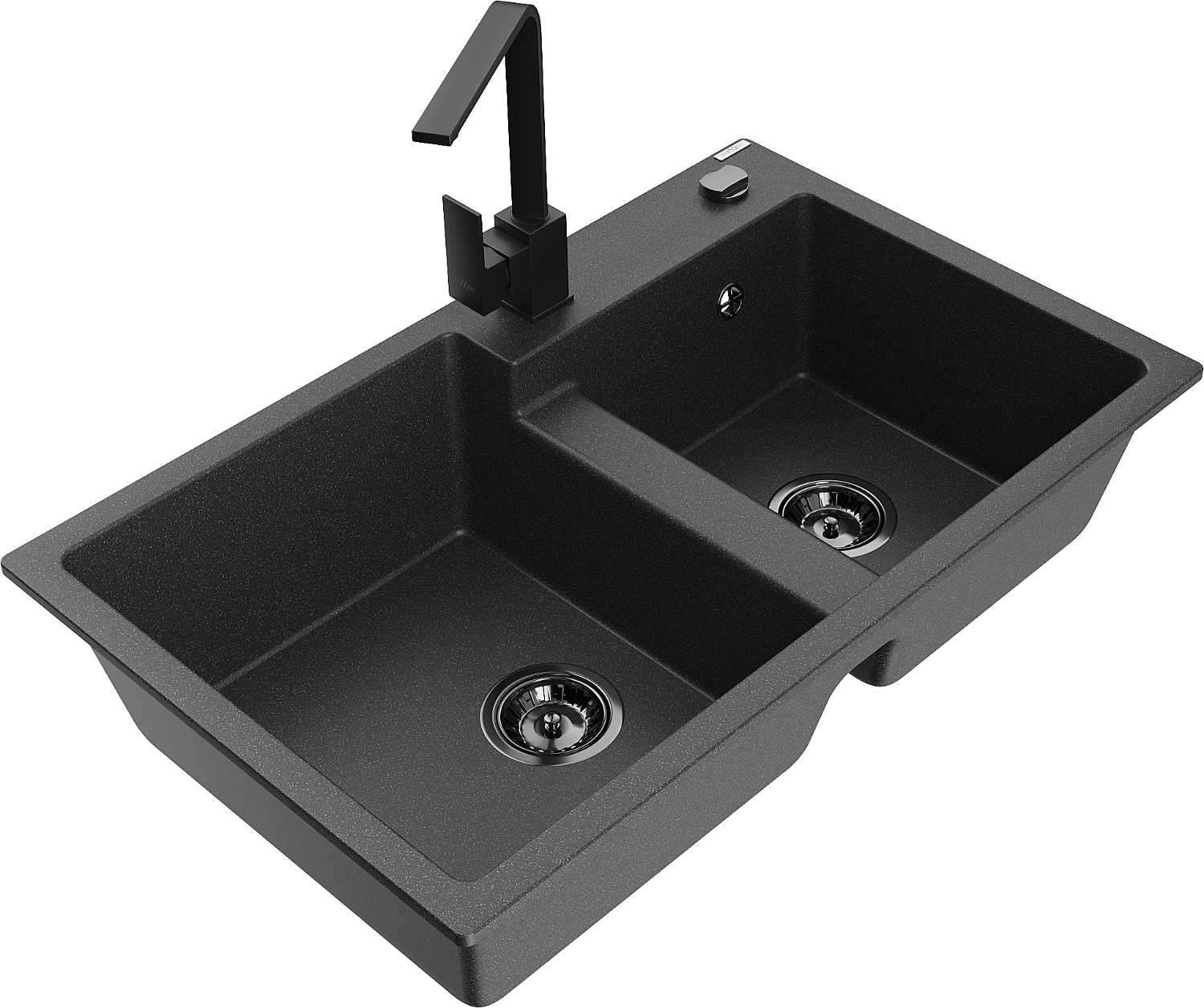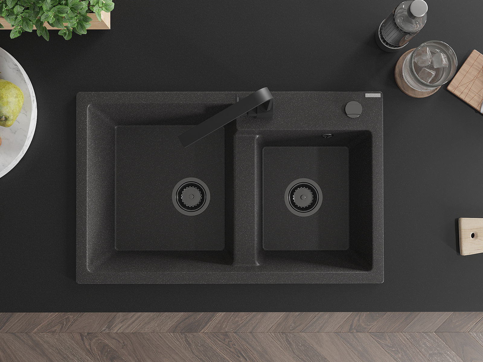 Mexen Tomas chiuvetă de bucătărie din granit cu 2 cuve și baterie de bucătărie Rita, negru stropit - 6516-76-670300-70-B