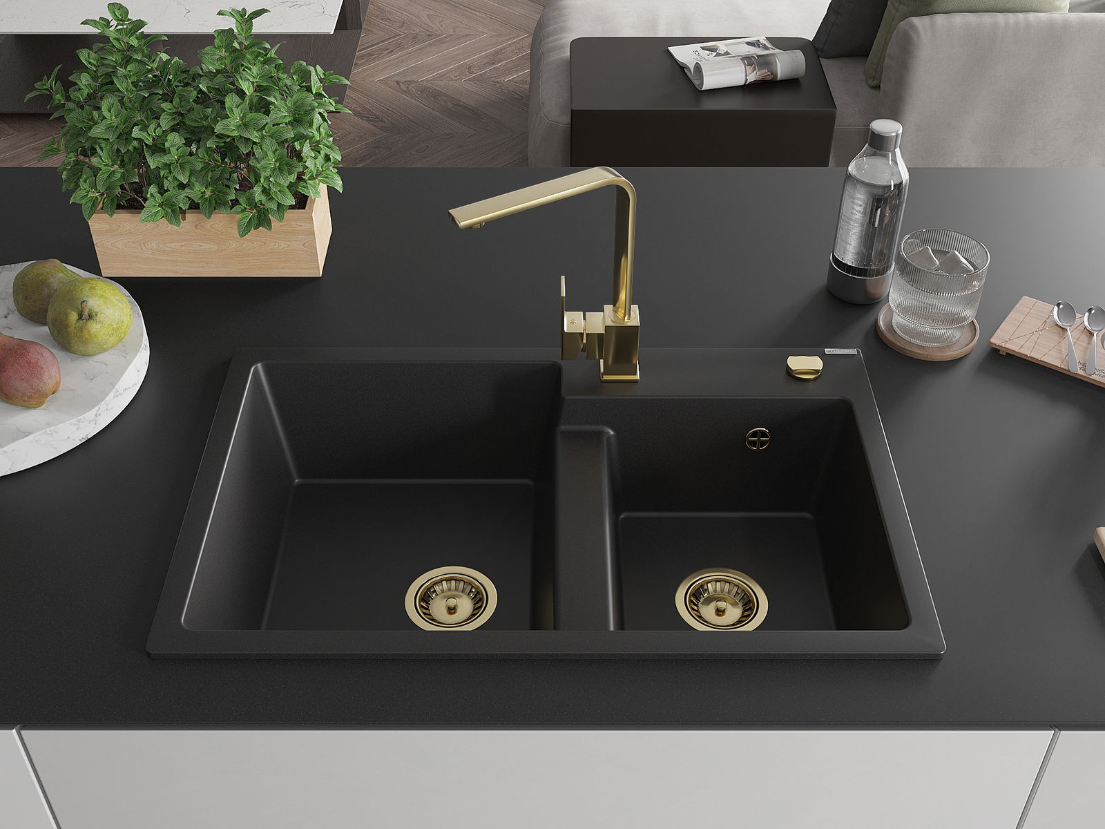Mexen Tomas chiuvetă de bucătărie din granit cu 2 compartimente și baterie de bucătărie Rita, negru - 6516-77-670300-50