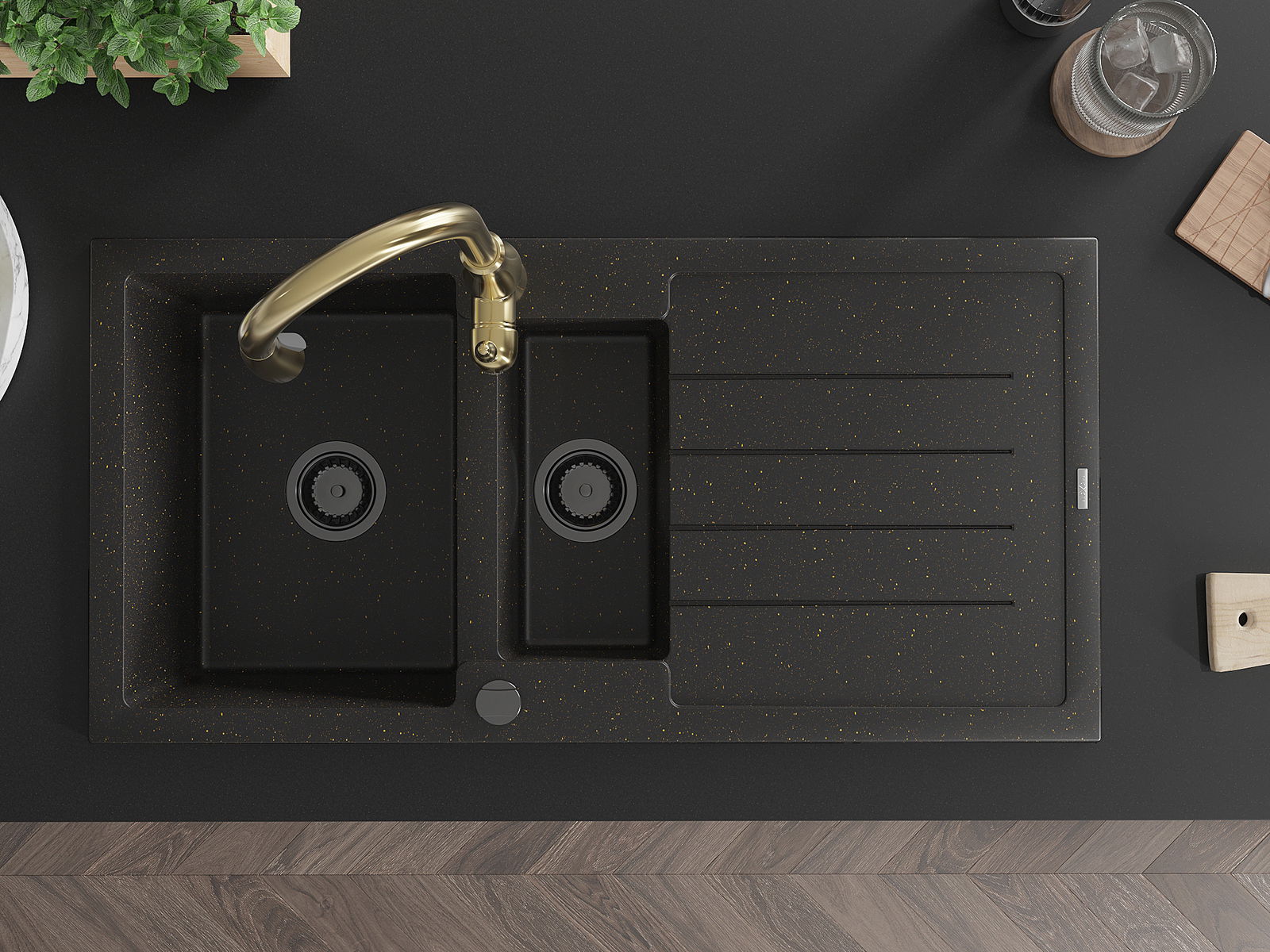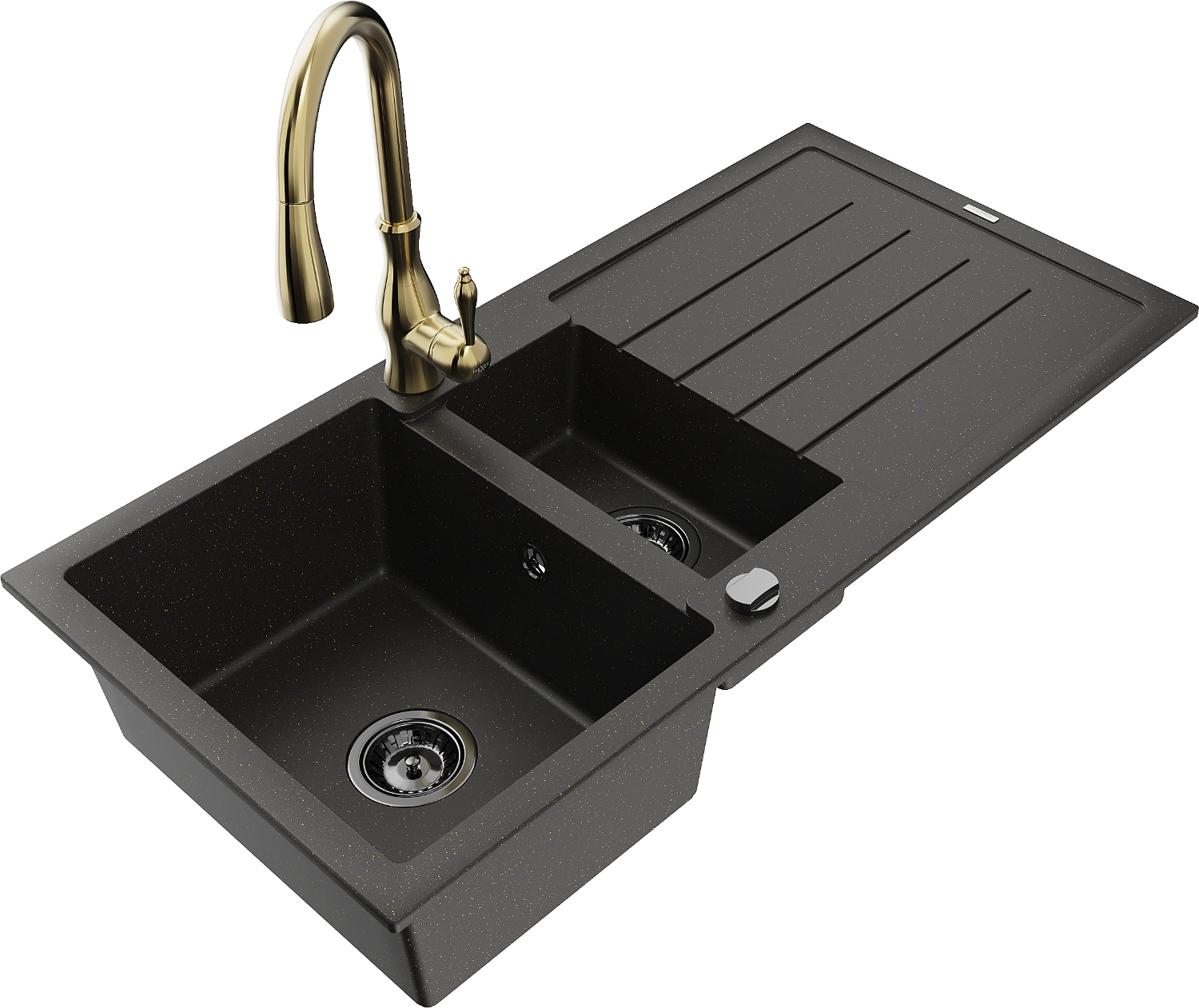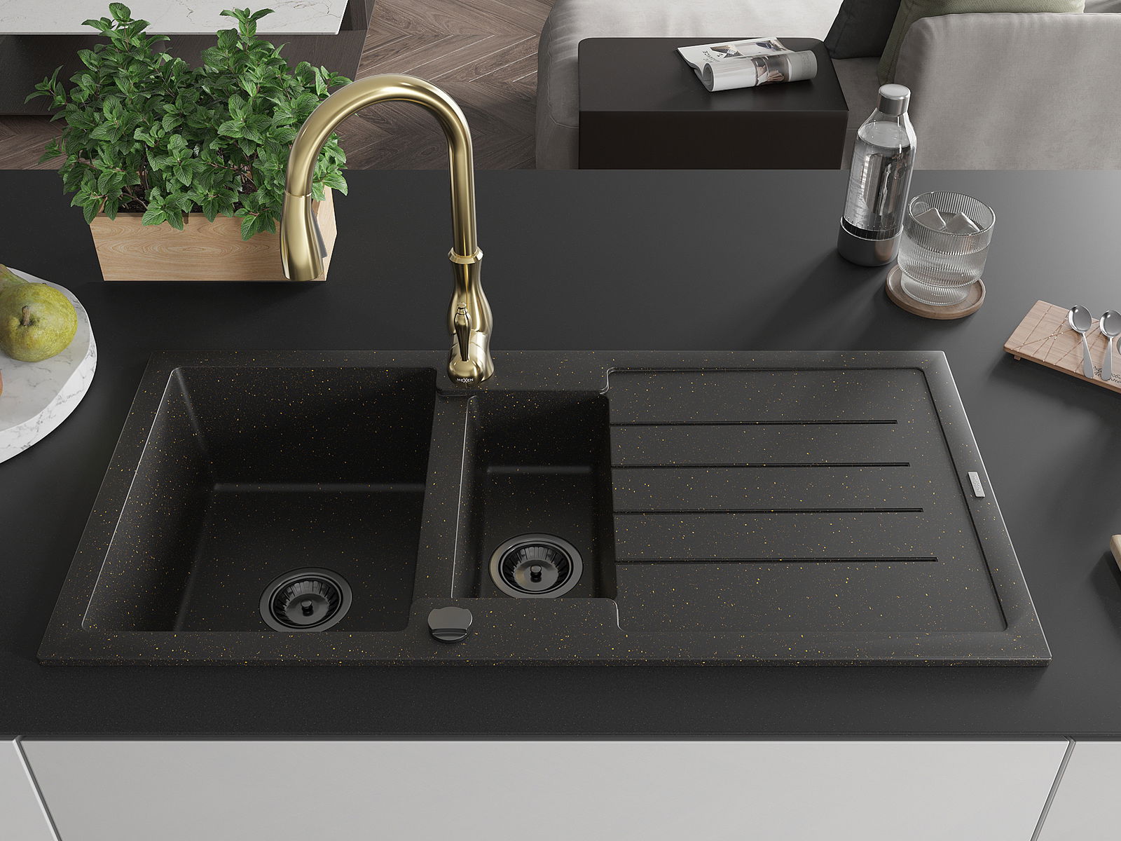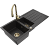 Mexen Andres chiuvetă din granit cu 1,5 cuve, cu scurgător și baterie de bucătărie Savita, negru/auriu