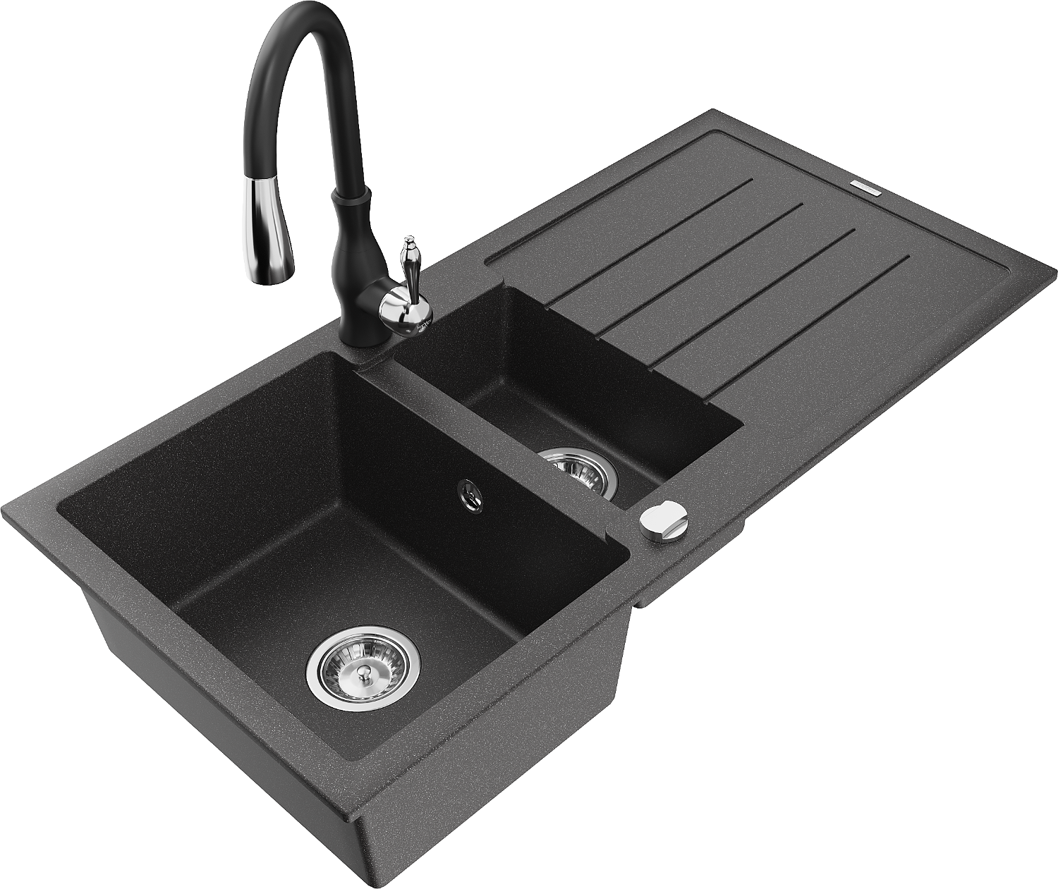 Mexen Andres chiuvetă de granit cu 1,5 compartimente cu scurgător și baterie de bucătărie Savita, negru cu pete