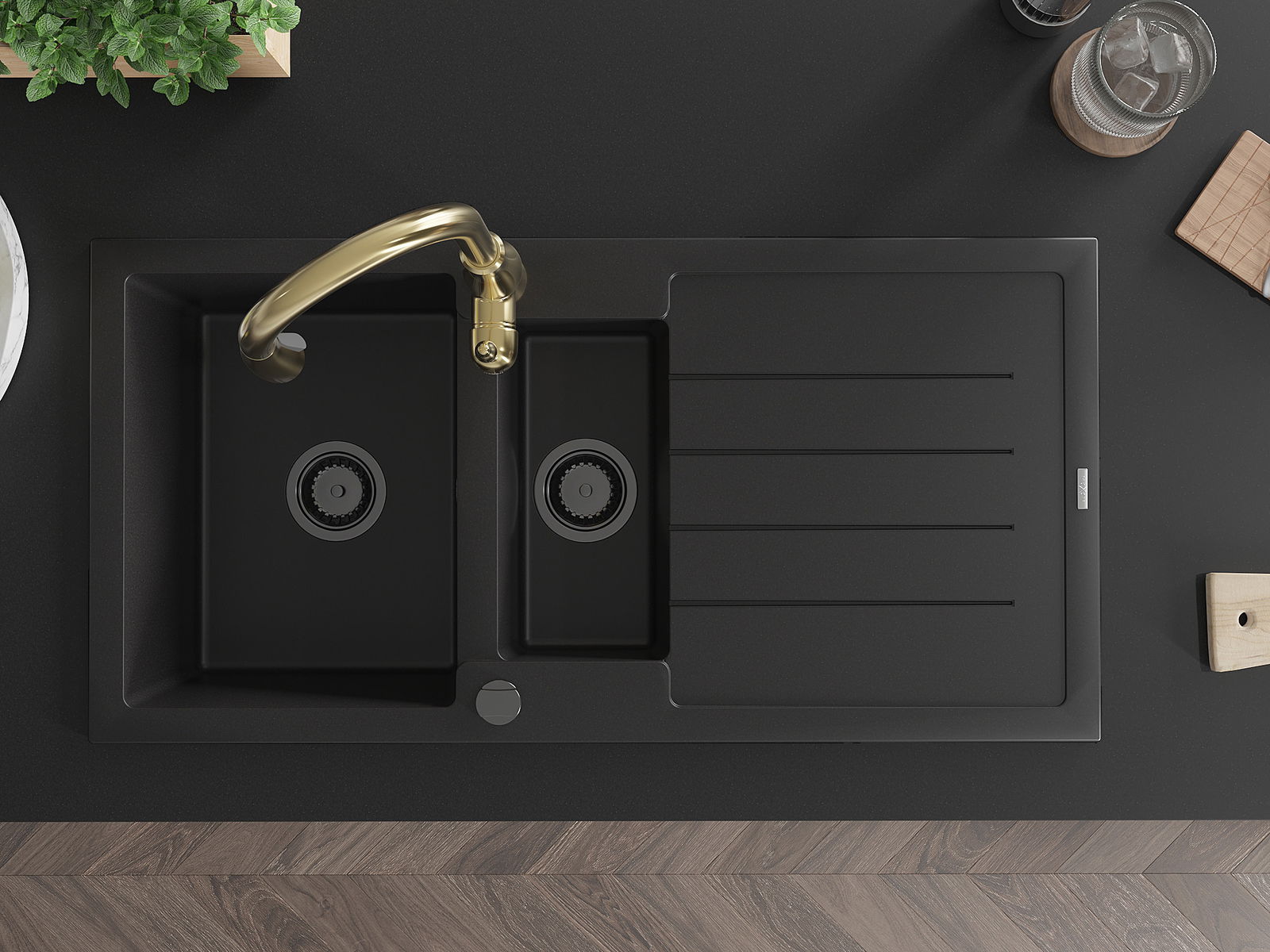 Chiuveta are 2 găuri legate cu un diametru de 35 mm, pentru auto -burst. Pot fi folosite, printre altele Pentru montarea unui distribuitor de lichid care va elimina prezența sticlelor de plastic în bucătărie și îi va oferi un finisaj elegant.