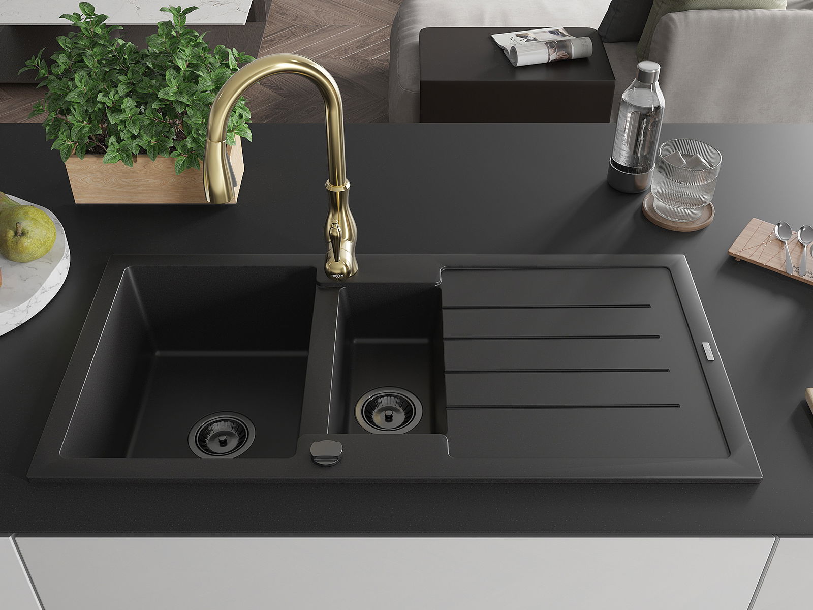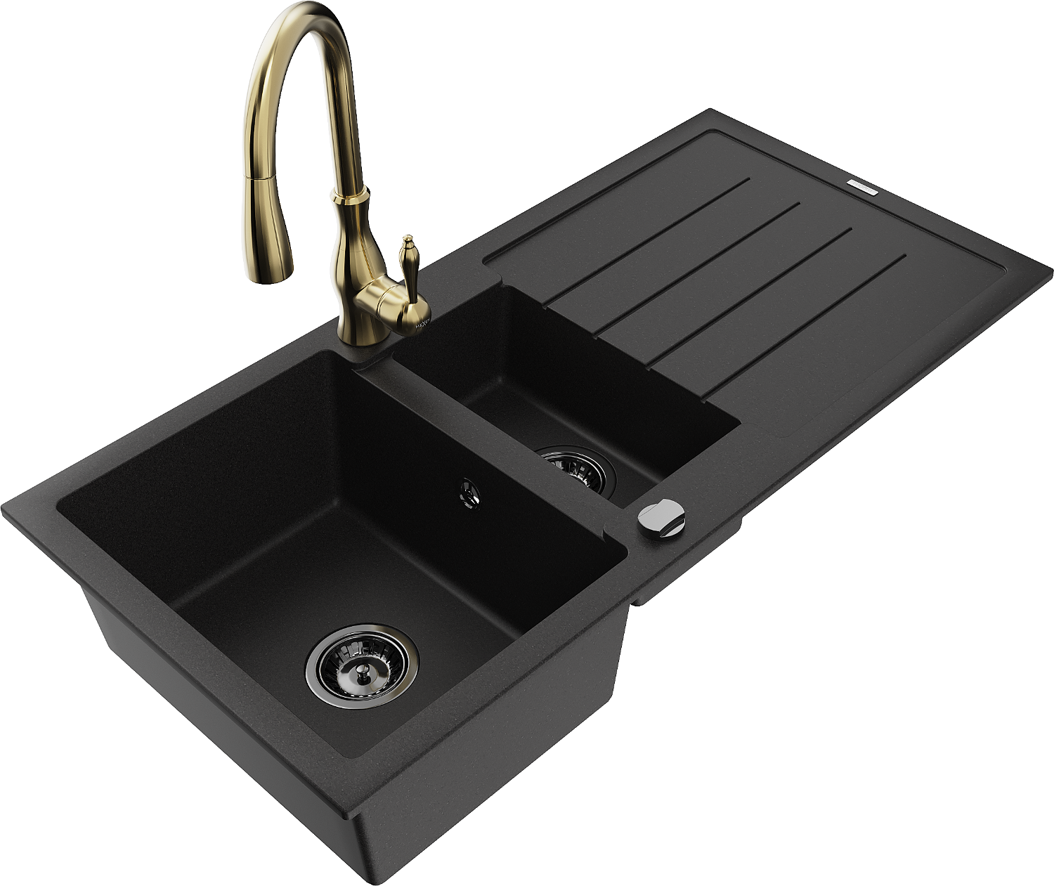 Mexen Andres chiuvetă din granit cu 1,5 compartimente și scurgător și baterie de bucătărie Savita, negru - 6515-77-672601-50-B