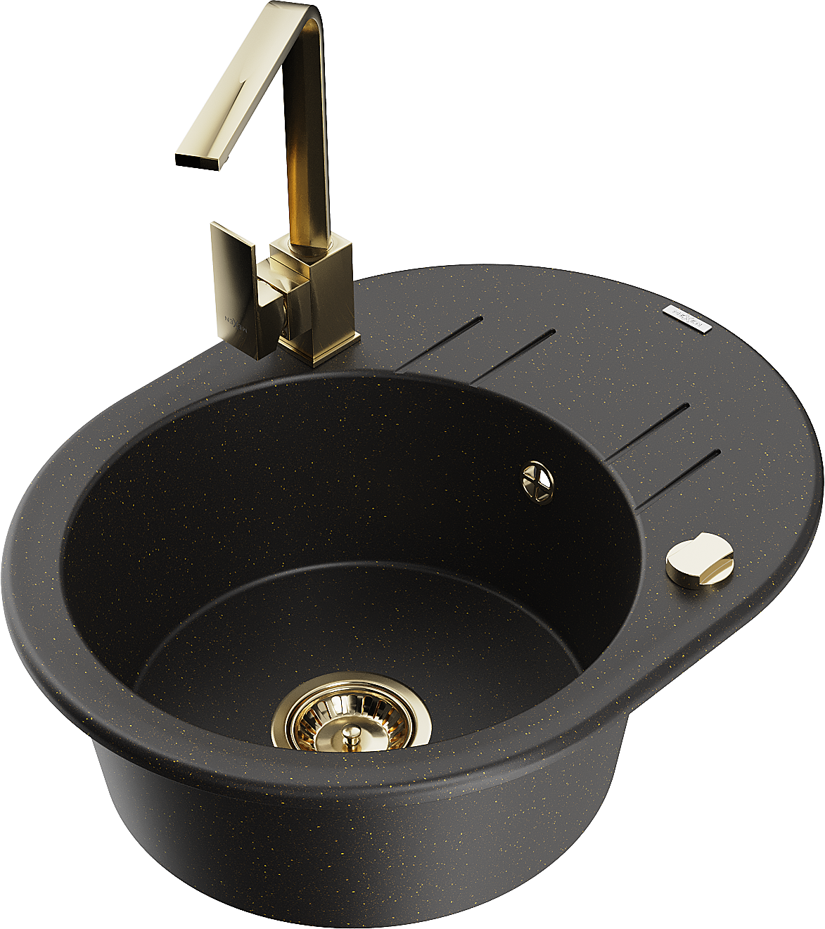 Mexen Kevin chiuvetă de granit cu o cuvă cu scurgător și baterie de bucătărie Rita, negru/auriu metalic