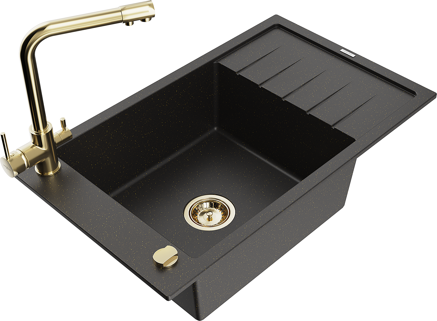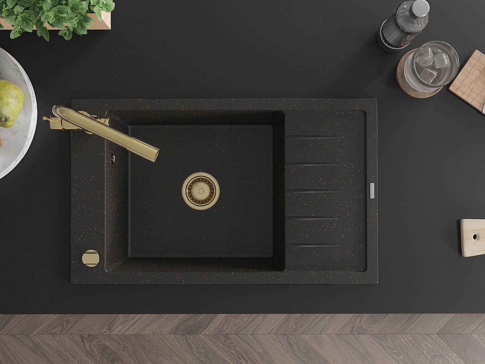 Mexen Elias chiuvetă de granit cu 1 compartiment, cu scurgător și baterie de bucătărie Duero, negru/auriu metalic