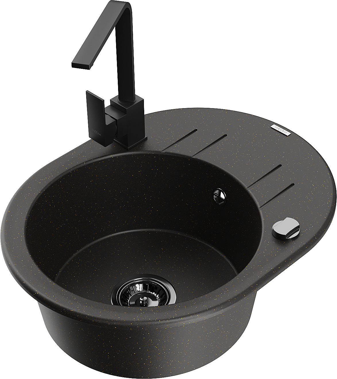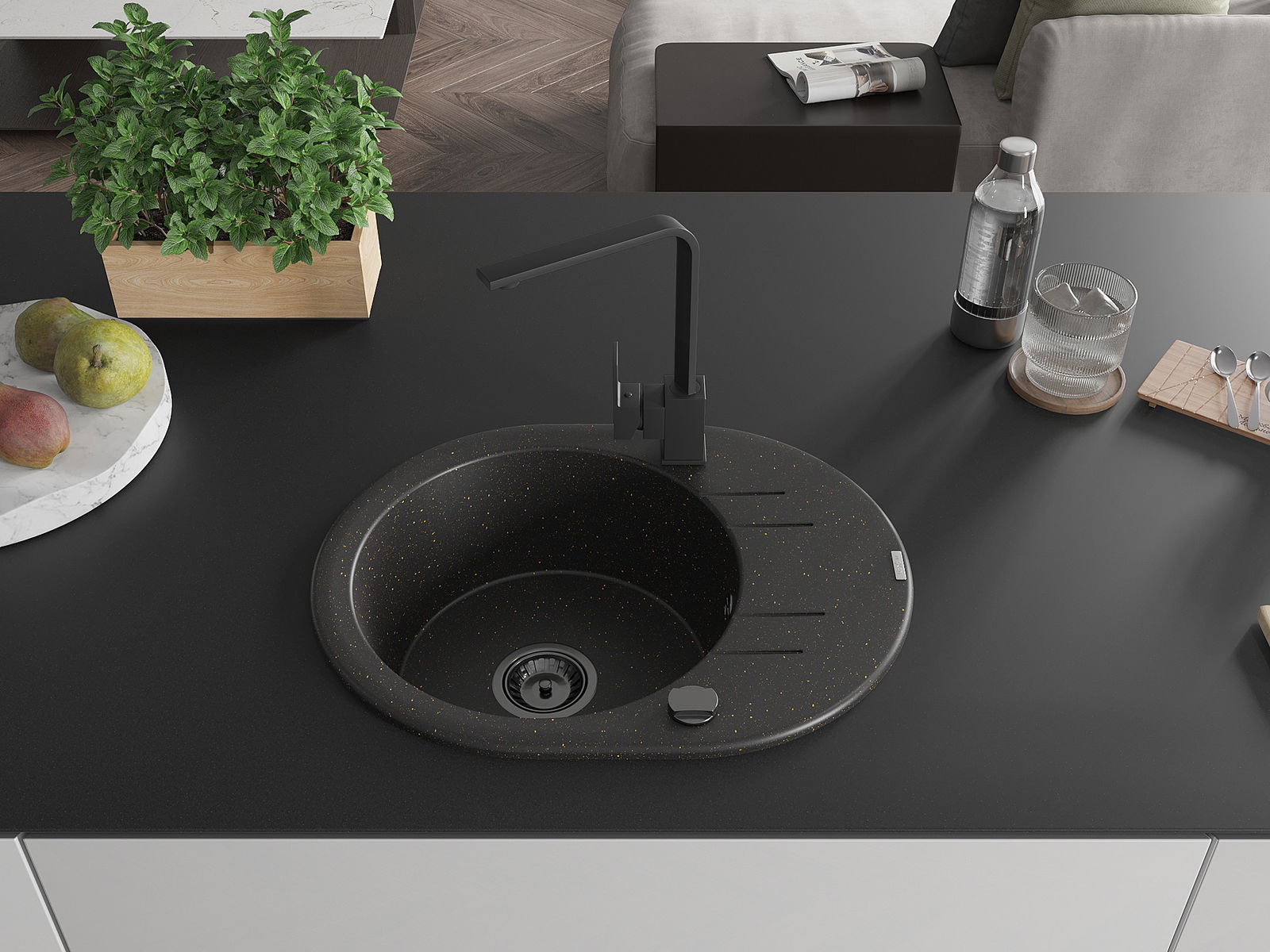 Mexen Kevin chiuvetă de granit cu 1 cuvă și picurător și baterie de bucătărie Rita, negru/auriu metalizat - 6517-75-670300-70-B