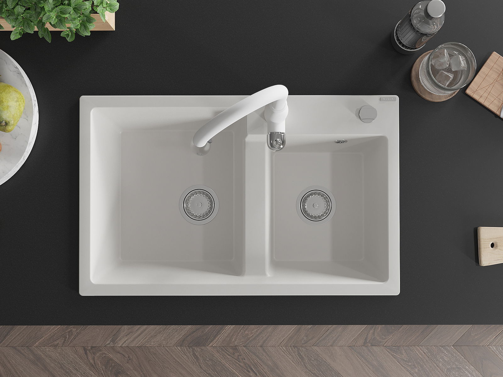 Mexen Tomas chiuvetă de bucătărie din granit cu 2 compartimente, cu baterie de bucătărie Savita, alb - 6516-20-672601-20
