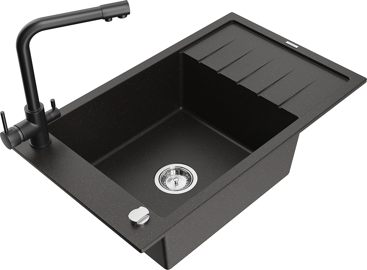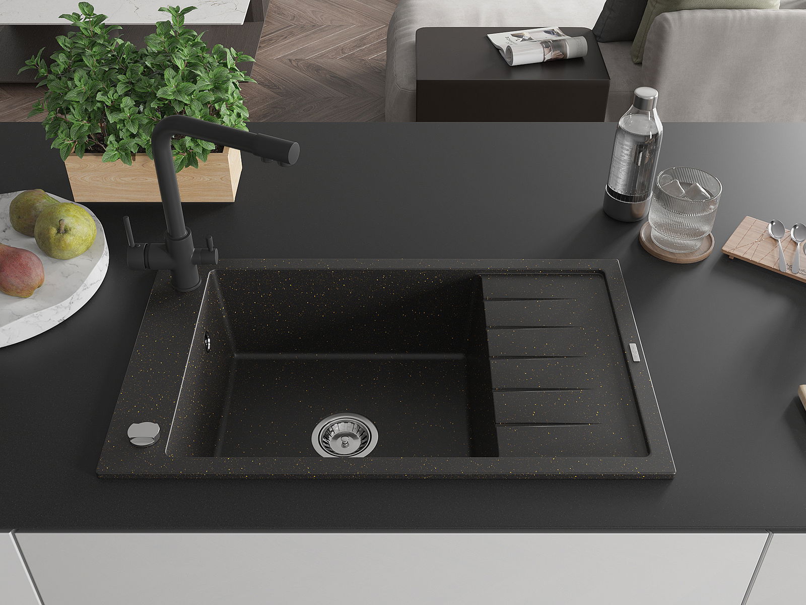 Mexen Elias chiuvetă de granit cu o cuvă și scurgător, cu baterie de bucătărie Duero, negru/auriu metalizat