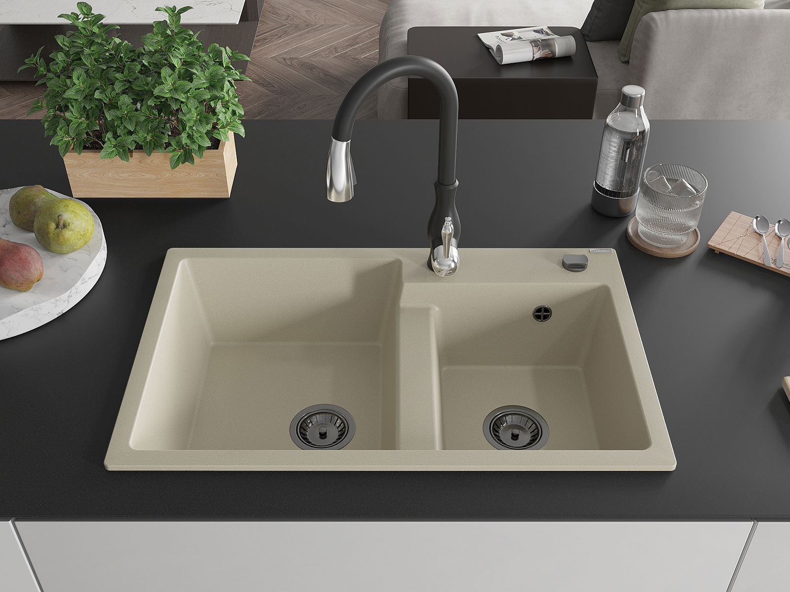 Mexen Tomas chiuvetă de bucătărie din granit cu 2 compartimente și baterie de bucătărie Savita, bej - 6516-69-672601-70