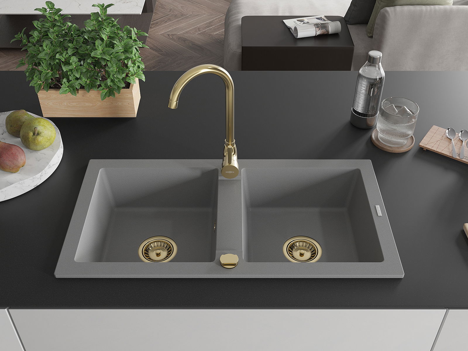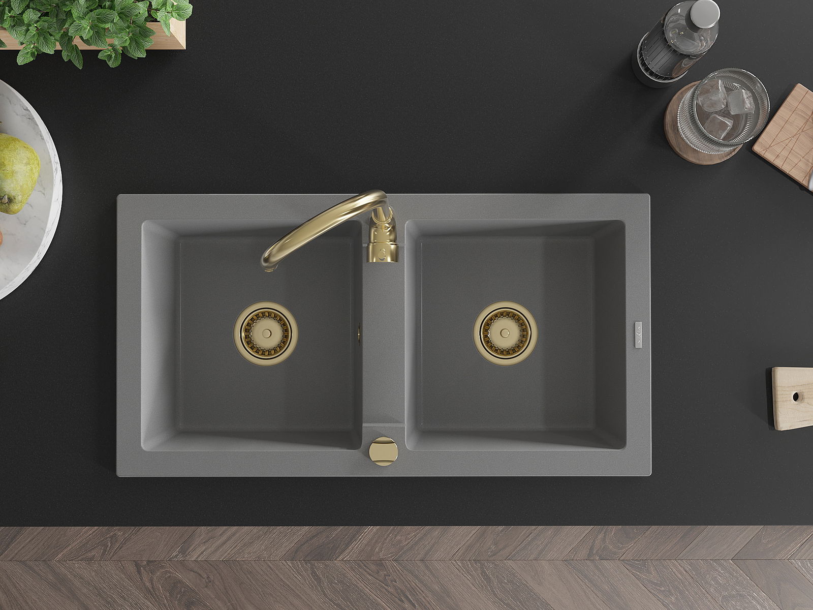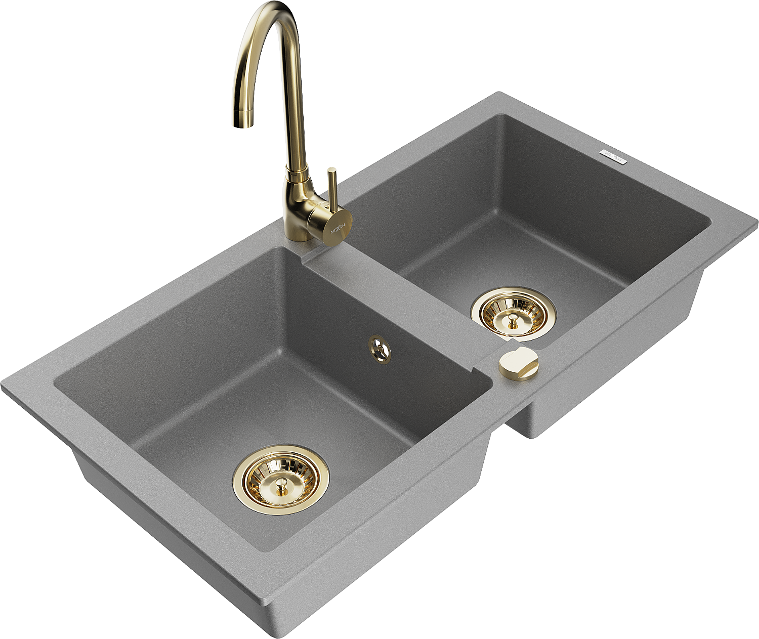 Mexen Mario chiuvetă de bucătărie din granit cu 2 compartimente și baterie Telma, gri - 6504-71-670200-50