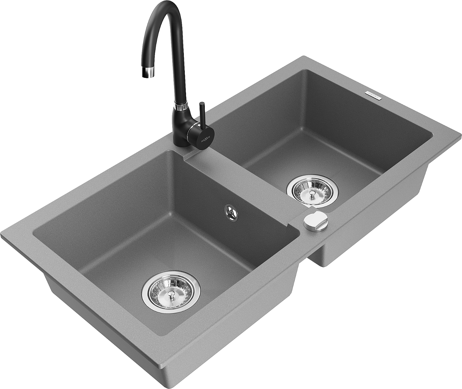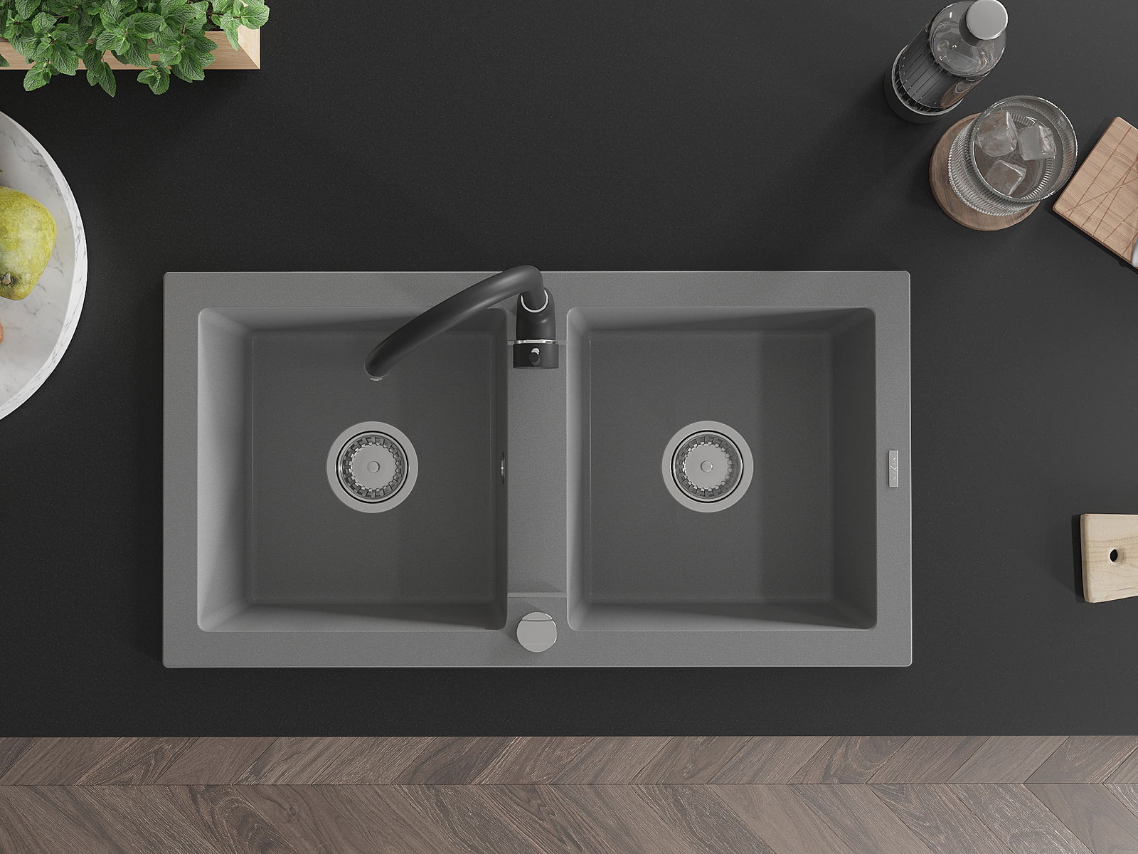Mexen Mario chiuvetă granit cu 2 compartimente și baterie de bucătărie Telma, gri - 6504-71-670200-70