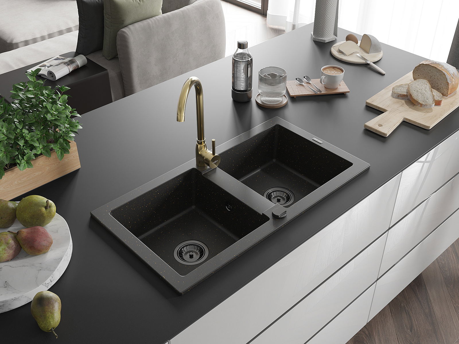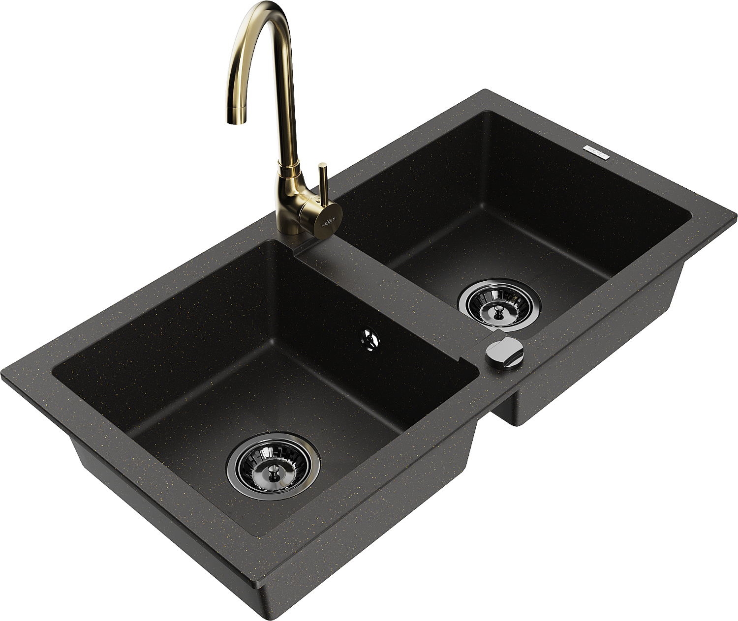 Mexen Mario chiuvetă de granit 2-compartimentată cu baterie de bucătărie Telma, negru/auriu - 6504-75-670200-50-B