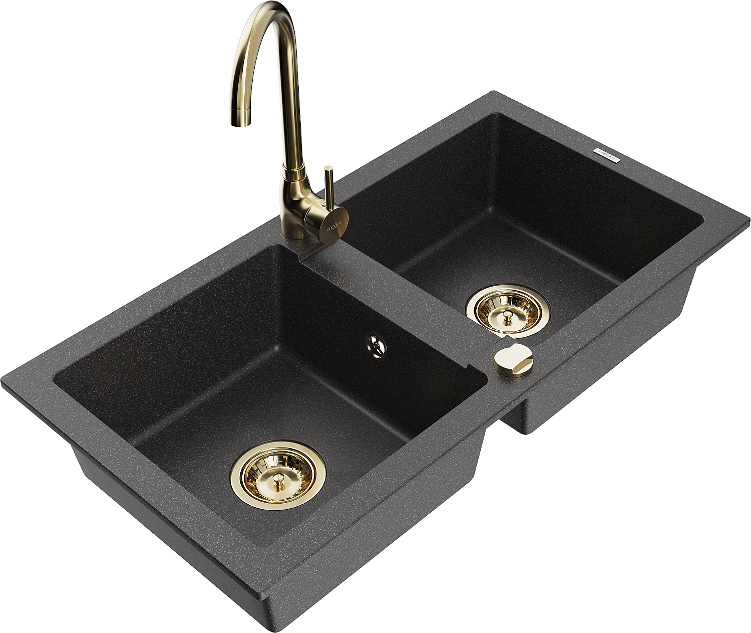 Mexen Mario chiuvetă de granit cu 2 camere și baterie de bucătărie Telma, negru pătat - 6504-76-670200-50